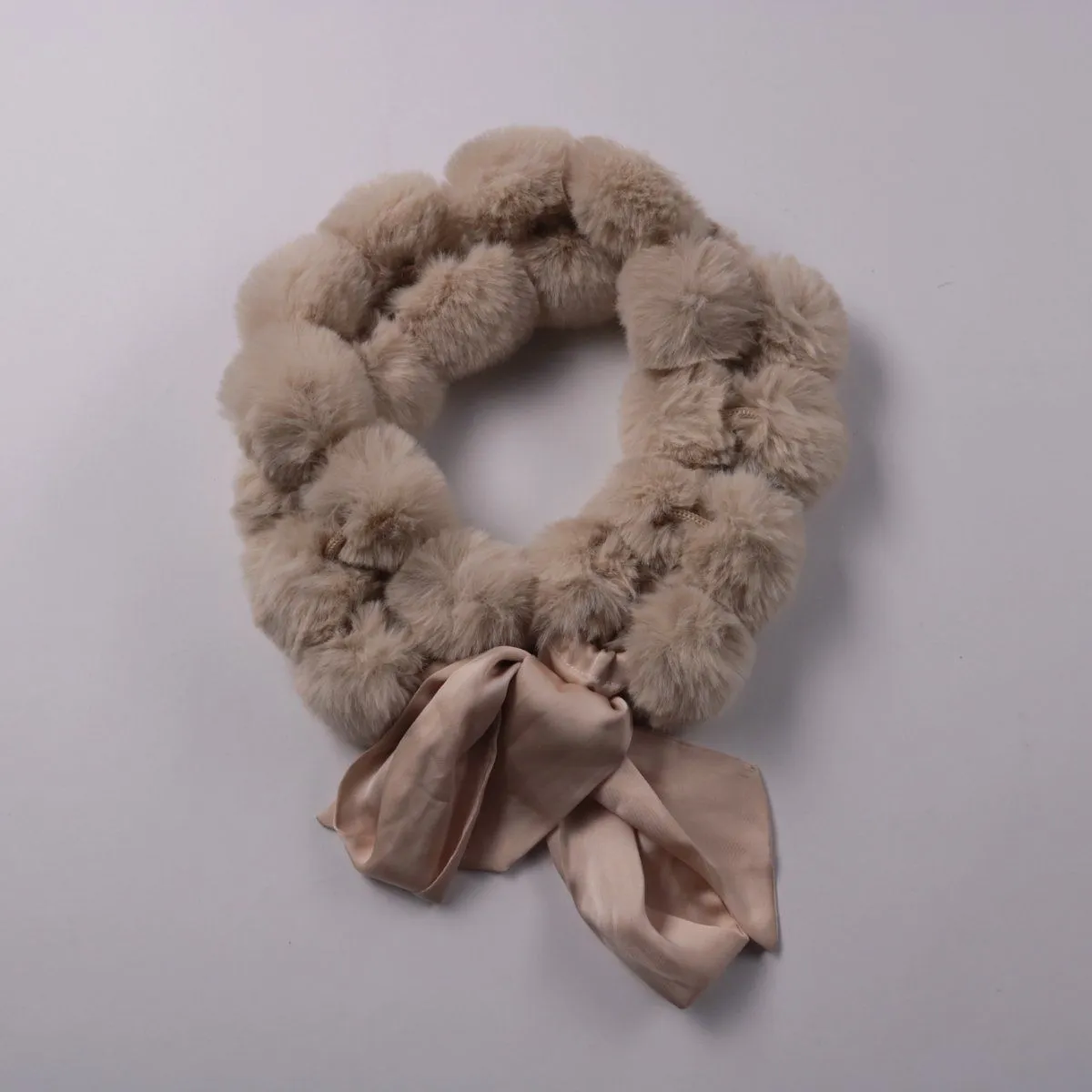 Мягкий меховой аксессуар с бантом из атласной ленты в бежевом оттенке. Подойдёт для демисезонных образов и прохладных вечеров, добавляет объём и фактуру. Лёгкий и приятный к коже, удобно носить с пальто или курткой.