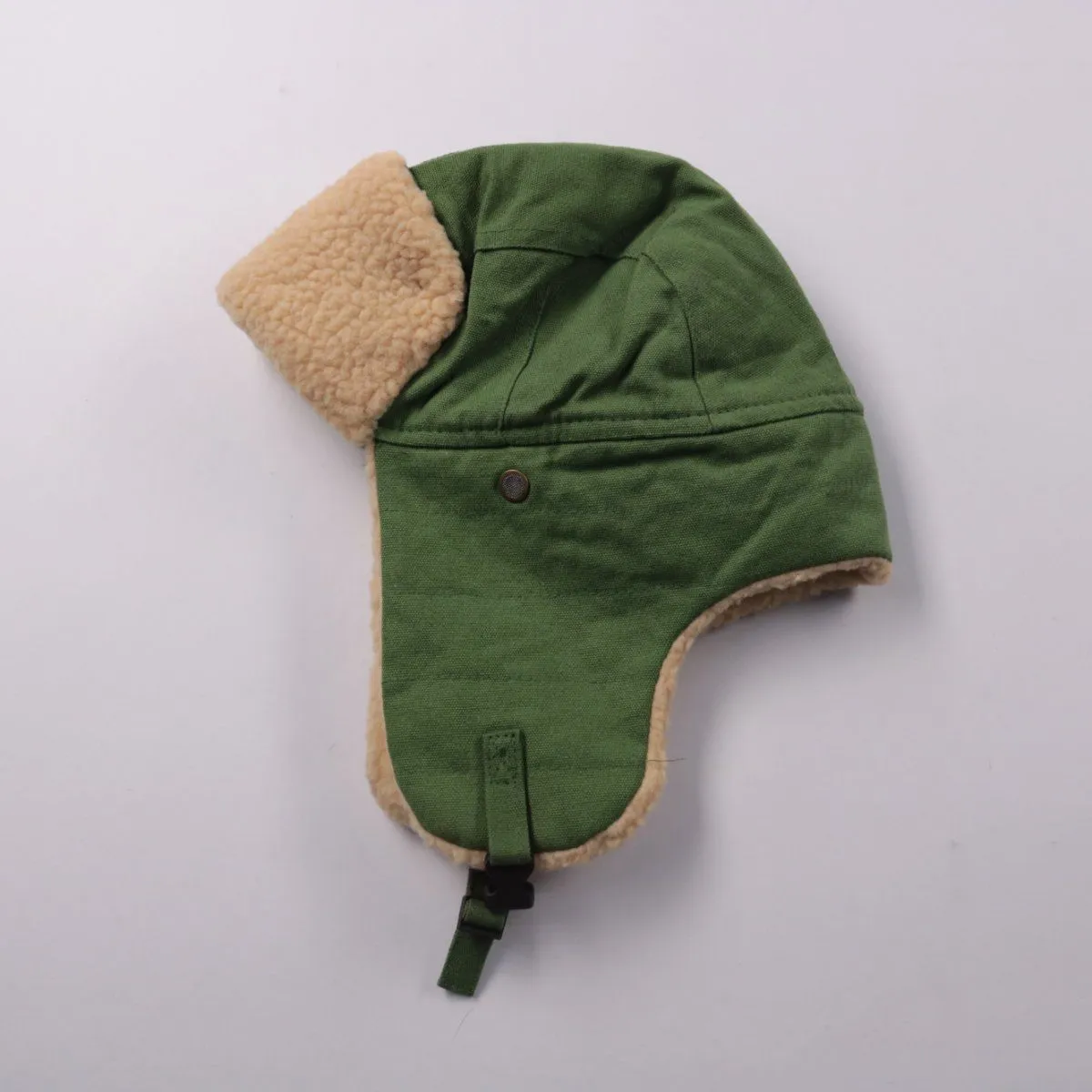 Зимняя шапка-ушанка зелёного цвета с меховой отделкой и застёжкой под подбородком. Подойдёт для прогулок и поездок в холодную погоду, хорошо закрывает уши и защищает от ветра. Практична тем, что фиксируется ремешком и не сползает.