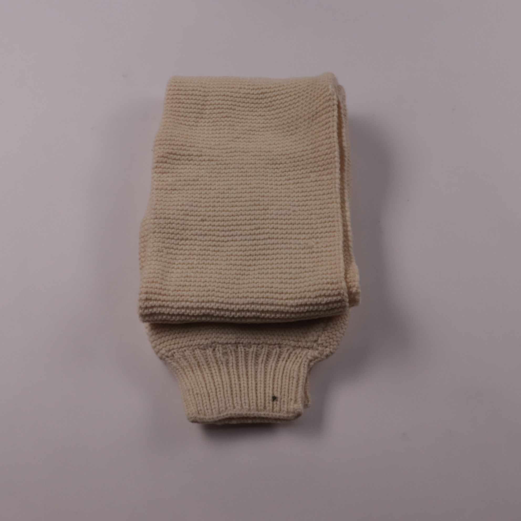 Трикотажные гетры бежевого цвета без видимого бренда. Подойдут для прохладной погоды и занятий спортом или танцами, легко надеваются поверх носков и обуви. Плотная вязка хорошо держит форму и сохраняет тепло.