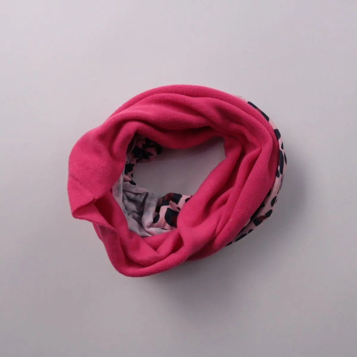 Снуд из мягкого флиса с яркой розовой стороной и вставкой с леопардовым принтом. Подойдёт для прогулок и активного отдыха в прохладную погоду, удобно носить с курткой или пальто. Хорошо закрывает шею и быстро надевается без завязывания.