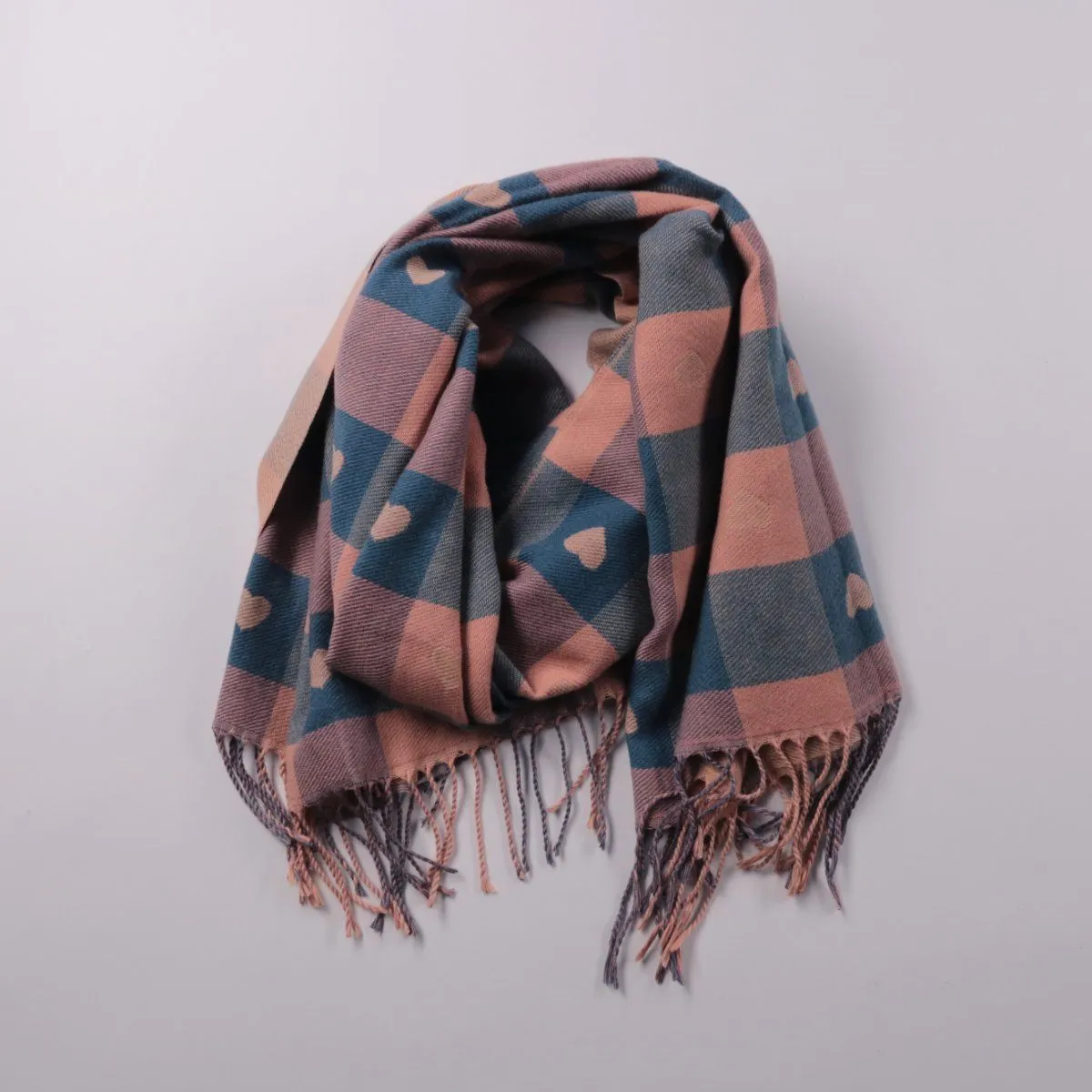 Шарф в клетку с небольшими сердечками и кисточками по краю, мягкий и приятный к коже. Подойдёт для прохладной погоды — на осень и весну, легко сочетается с базовыми куртками и пальто. Длинный формат позволяет завязывать разными способами и хорошо закрывает шею от ветра.