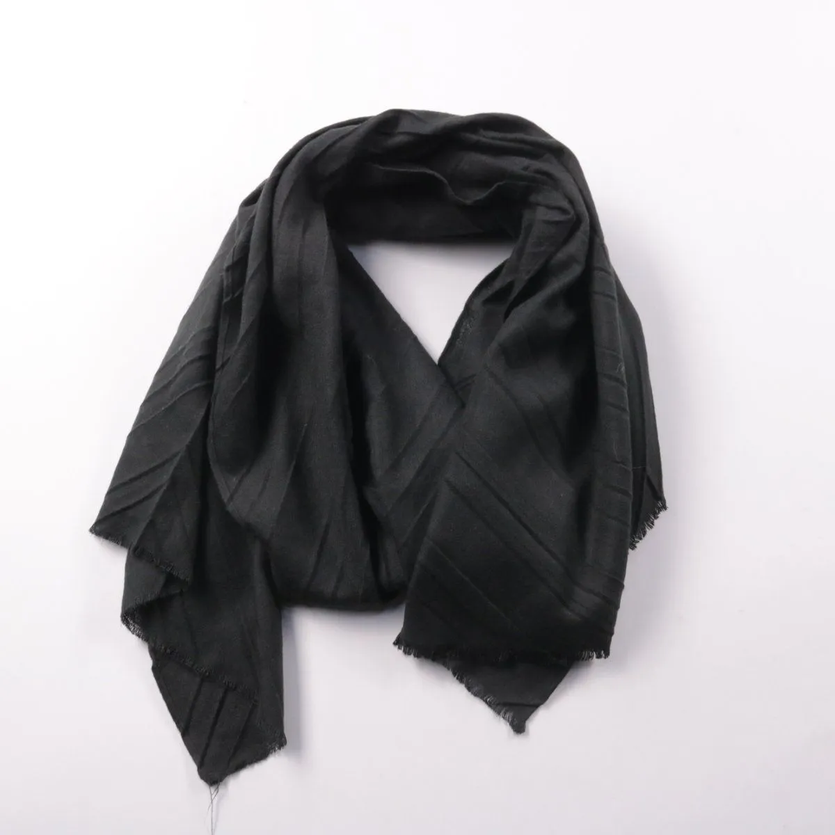 Чёрный шарф без указанного бренда, с фактурными диагональными полосами и бахромой по краю. Подойдёт на каждый день и к более строгим образам, легко сочетается с пальто или курткой. Практичный тёмный цвет немаркий и универсальный.