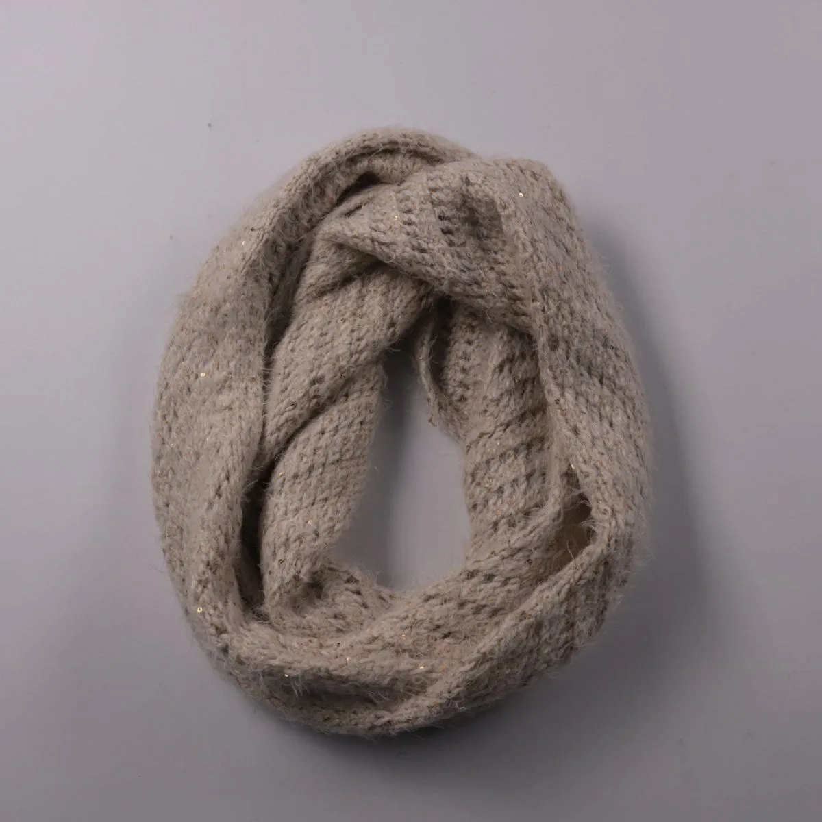 Вязаный шарф‑снуд в бежевом цвете с лёгкой фактурой и небольшим блеском нити. Подойдёт для холодной погоды и повседневных образов, удобно носить поверх пальто или пуховика. Хорошо закрывает шею и не развязывается при носке.