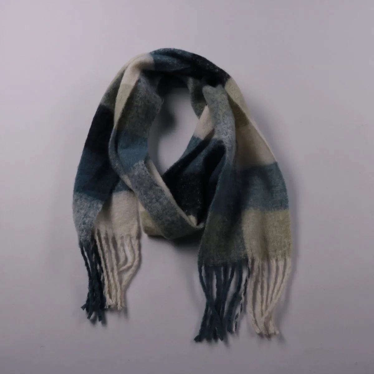 Шарф Primark в крупную клетку в сине-серо-бежевой гамме, с кисточками по краям. Подойдёт для повседневных образов в прохладную погоду и для поездок. Мягкий и объёмный, хорошо защищает шею от ветра.