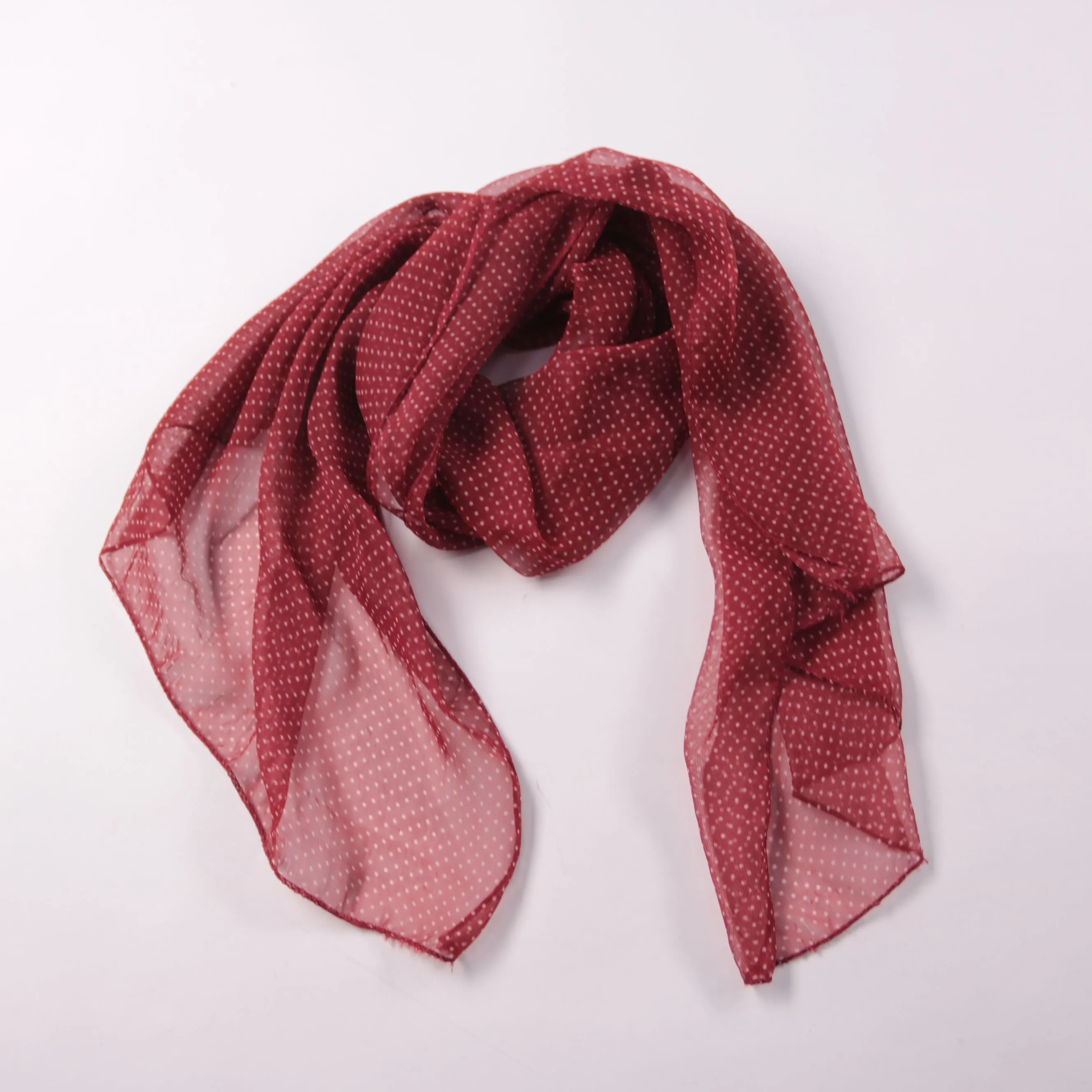 Лёгкий шарф из полупрозрачной ткани бордового цвета в мелкий белый горошек, бренд не указан. Подойдёт для повседневных образов, можно носить на шее или завязывать на сумке. Тонкий материал легко складывается и почти не занимает места в сумке.