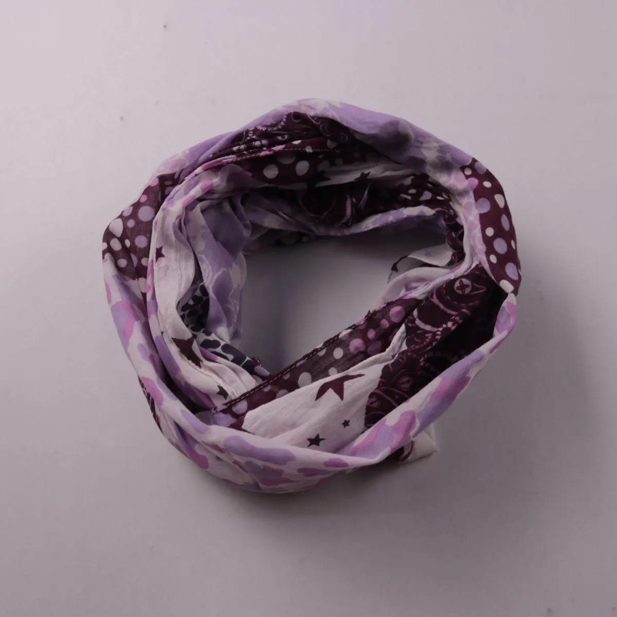 Лёгкий шарф-снуд без бренда с сиренево-бордовым комбинированным принтом (горошек, узоры, звёзды). Подойдёт для демисезонной погоды и как акцент к повседневным образам. Удобно носить кольцом — быстро надевается и не развязывается.