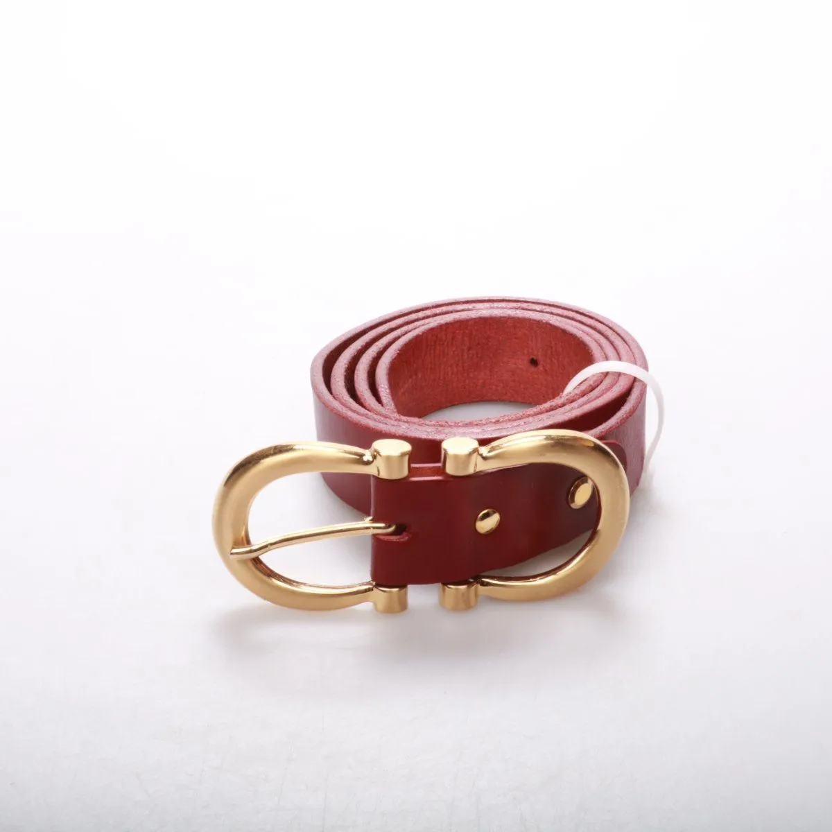 Кожаный ремень бордового цвета с золотистой овальной пряжкой. Подойдёт для джинсов, брюк и платьев, когда нужен аккуратный акцент в образе. Прочный материал и надёжная фурнитура хорошо держат форму и долго служат.