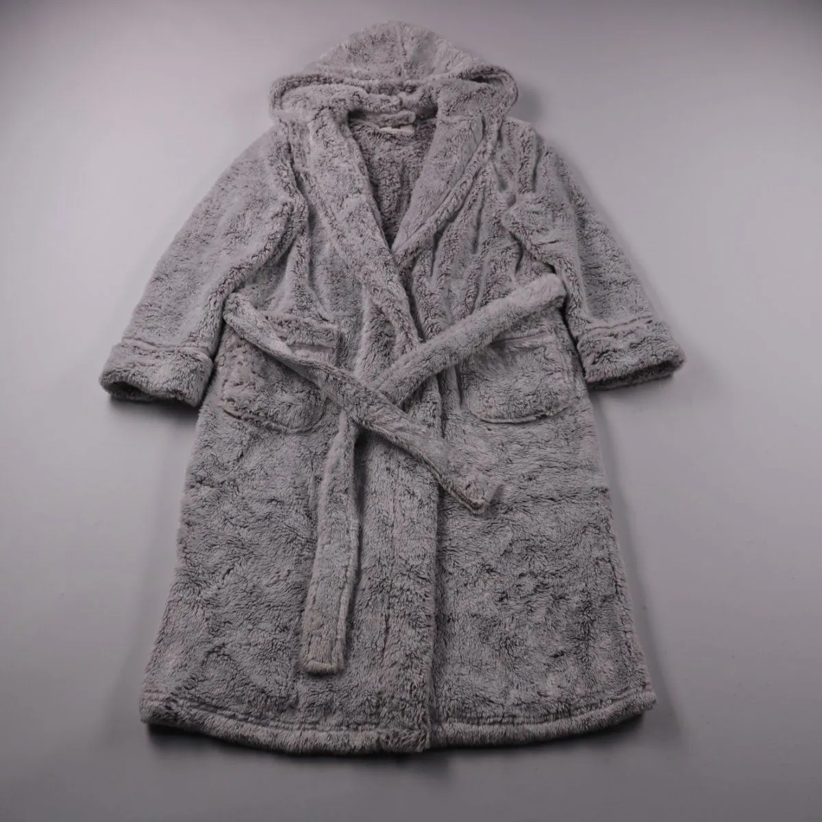 Мягкий плюшевый халат F&F серого цвета с капюшоном, поясом и накладными карманами. Подойдёт для дома после ванны, бассейна или чтобы согреться в прохладные вечера. Ткань приятная к телу и хорошо удерживает тепло.