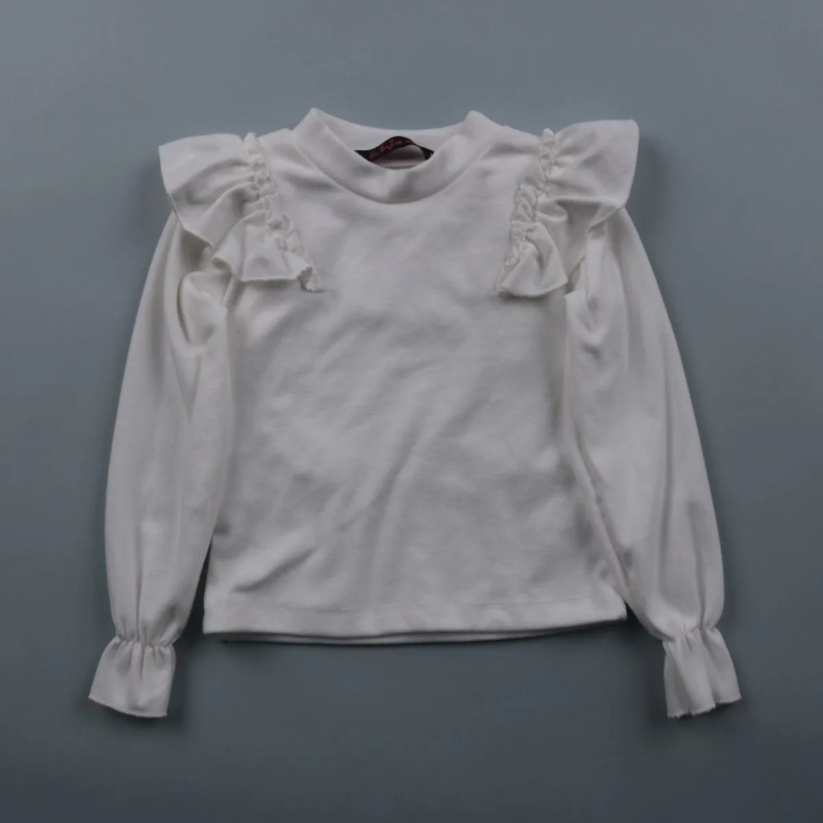 Детская блузка Ehiaa белого цвета с длинным рукавом и воланами на плечах. Подойдёт для школы, праздников и повседневных образов, легко сочетается с юбкой или брюками. Ткань с добавлением эластана лучше тянется и комфортнее в носке.
