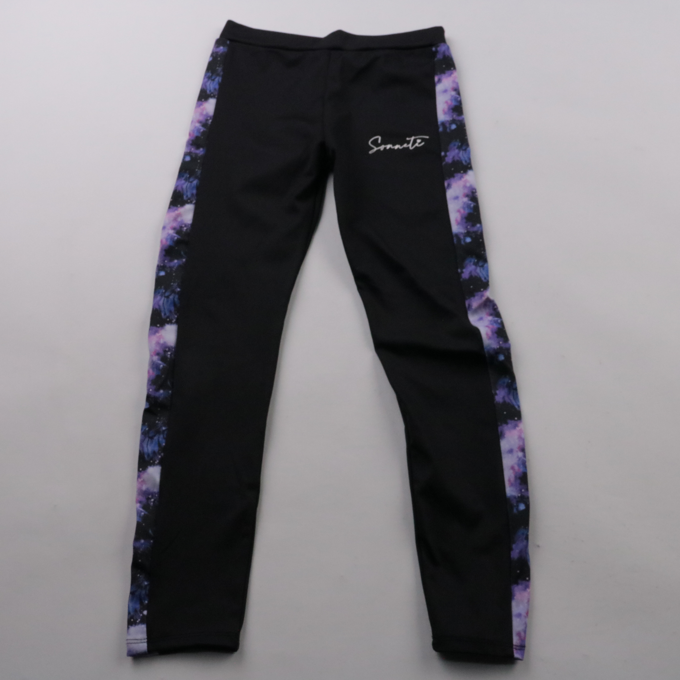Легинсы Sonneti London чёрного цвета с боковыми вставками с принтом «космос». Подойдут для занятий спортом, танцев или активных прогулок. Эластичный пояс удобно сидит и не сковывает движения.