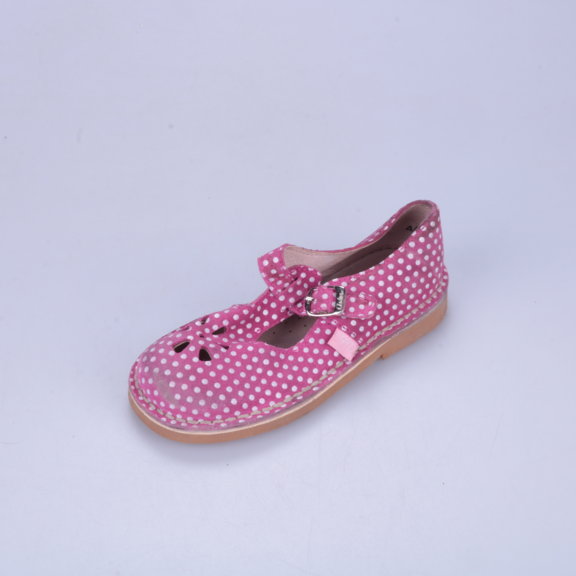 Детские туфли Cienta розового цвета в белый горошек, с ремешком на пряжке и декоративной перфорацией спереди. Подойдут для прогулок и в садик в тёплую погоду. Лёгкая подошва и застёжка помогают быстро надевать и надёжно фиксировать обувь на ноге.