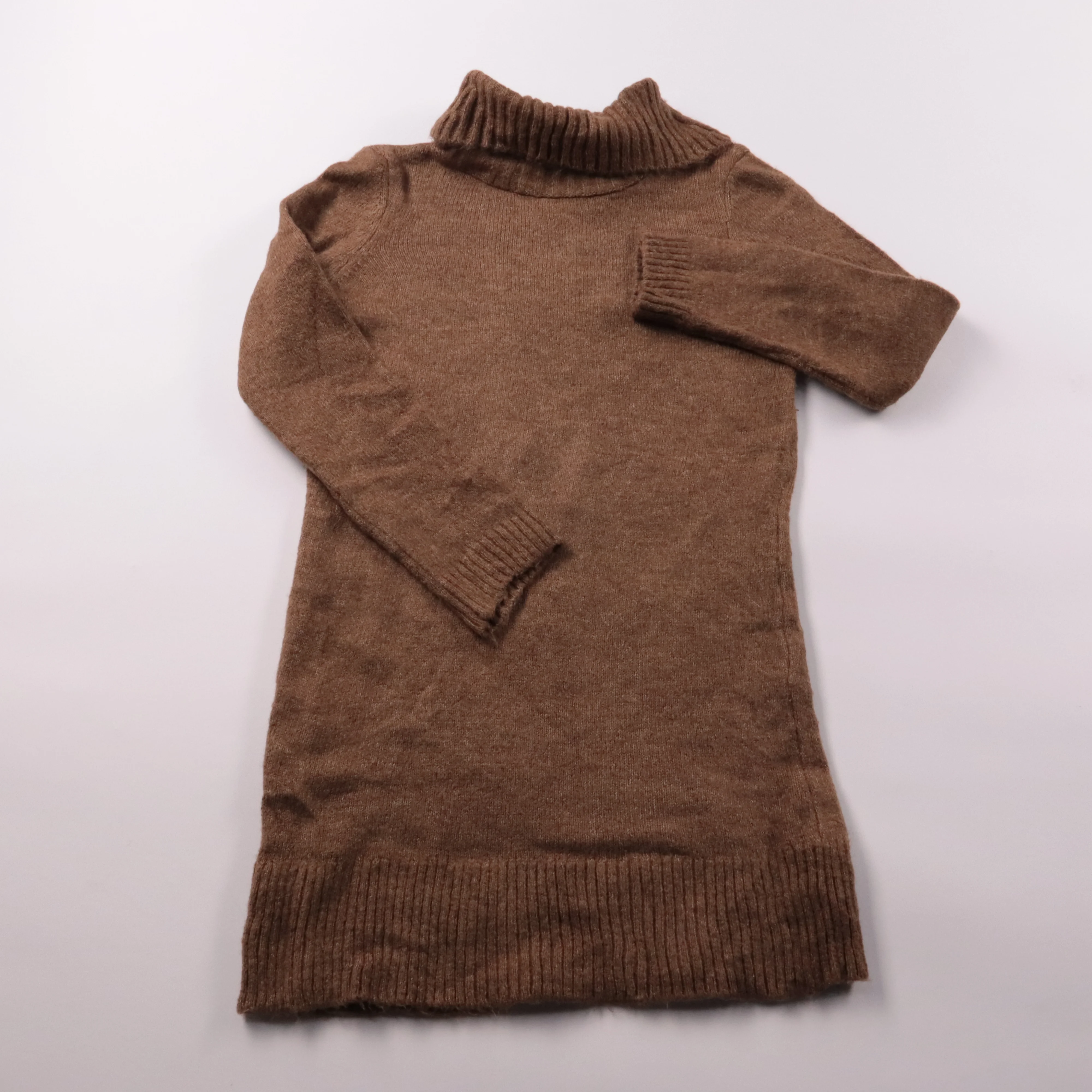 Вязаное платье Kids Only коричневого цвета с высоким воротником-гольфом и длинными рукавами. Подойдёт для школы, прогулок и повседневной носки в прохладную погоду, хорошо сочетается с колготками и сапогами. Мягкий трикотаж тянется и не сковывает движения.