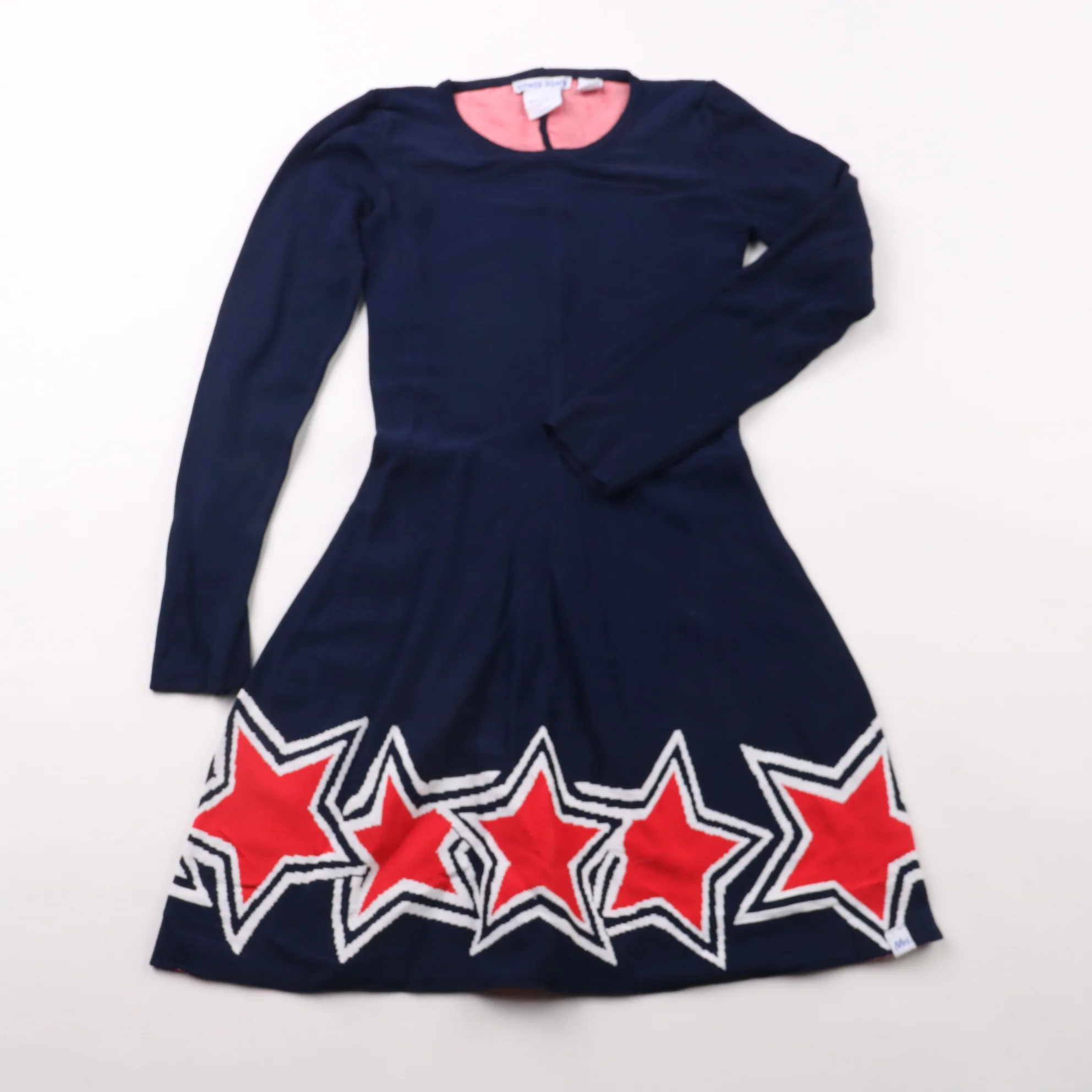 Платье Nik&Nik (линейка Flower Power) тёмно-синего цвета с длинным рукавом и контрастными звёздами по низу. Подойдёт для школы и повседневной носки в прохладную погоду. Практичный трикотаж хорошо тянется и не сковывает движения.