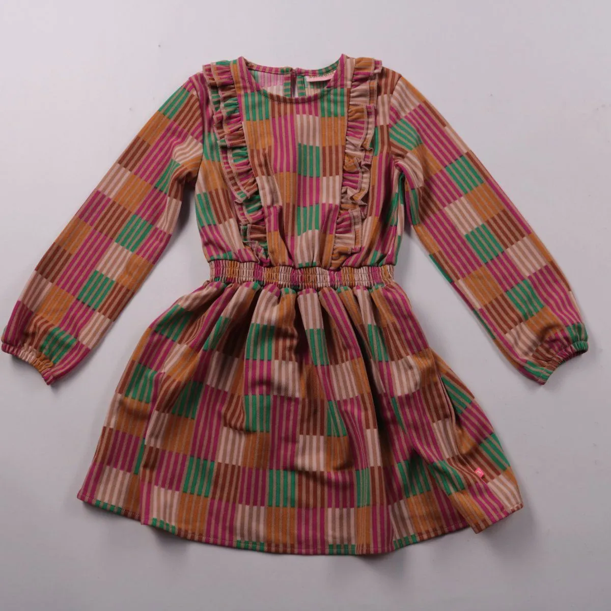 Платье Someone с длинным рукавом и ярким полосатым принтом, с оборками спереди. Подойдёт для повседневной носки в садик или школу в прохладную погоду. Эластичная талия хорошо садится по фигуре и не сковывает движения.