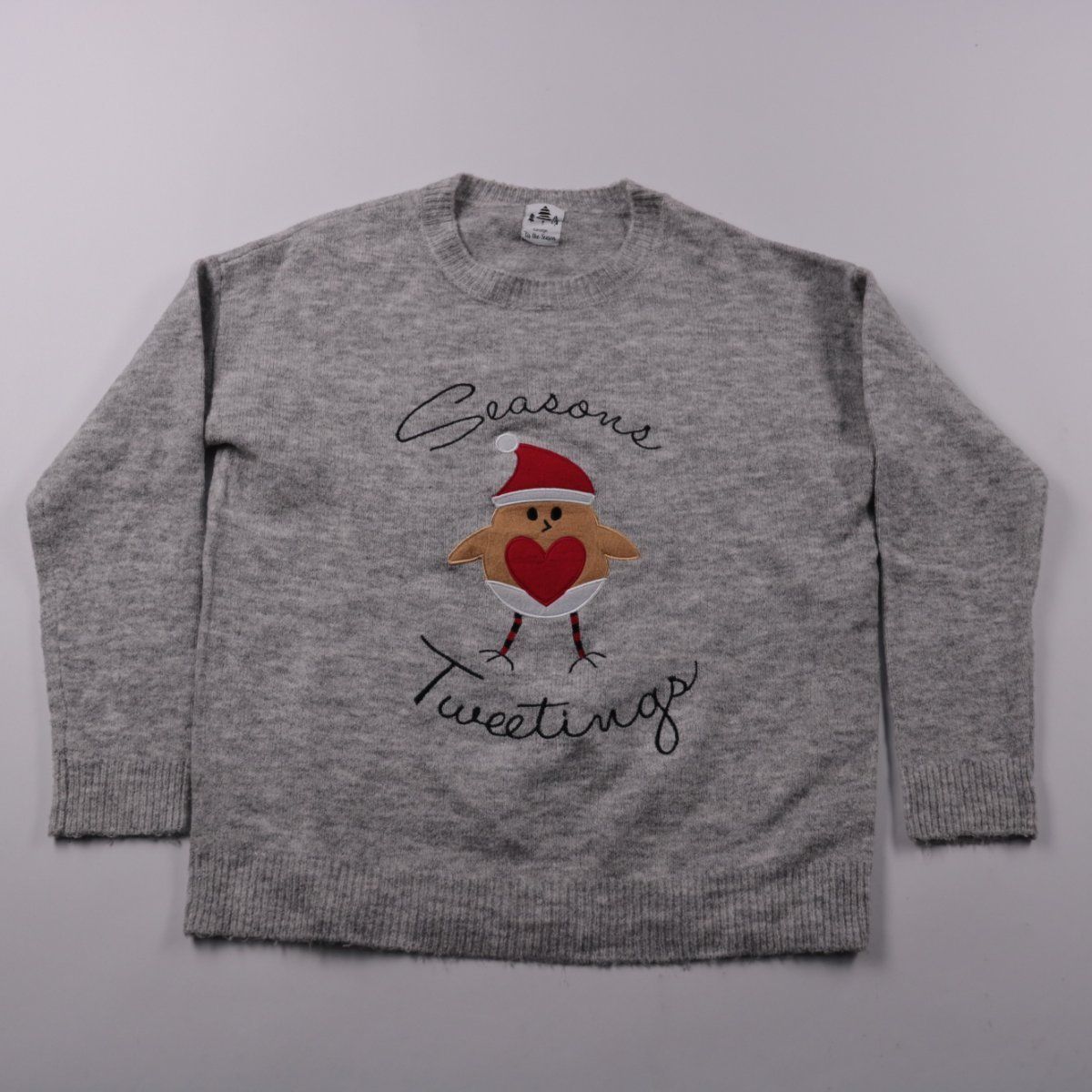 Серый вязаный свитер George с новогодним принтом и вышитой надписью Season Tweetings. Подойдёт для зимы и праздничных выходов в сад/школу или на прогулку. Мягкий трикотаж тянется и хорошо сидит под курткой.