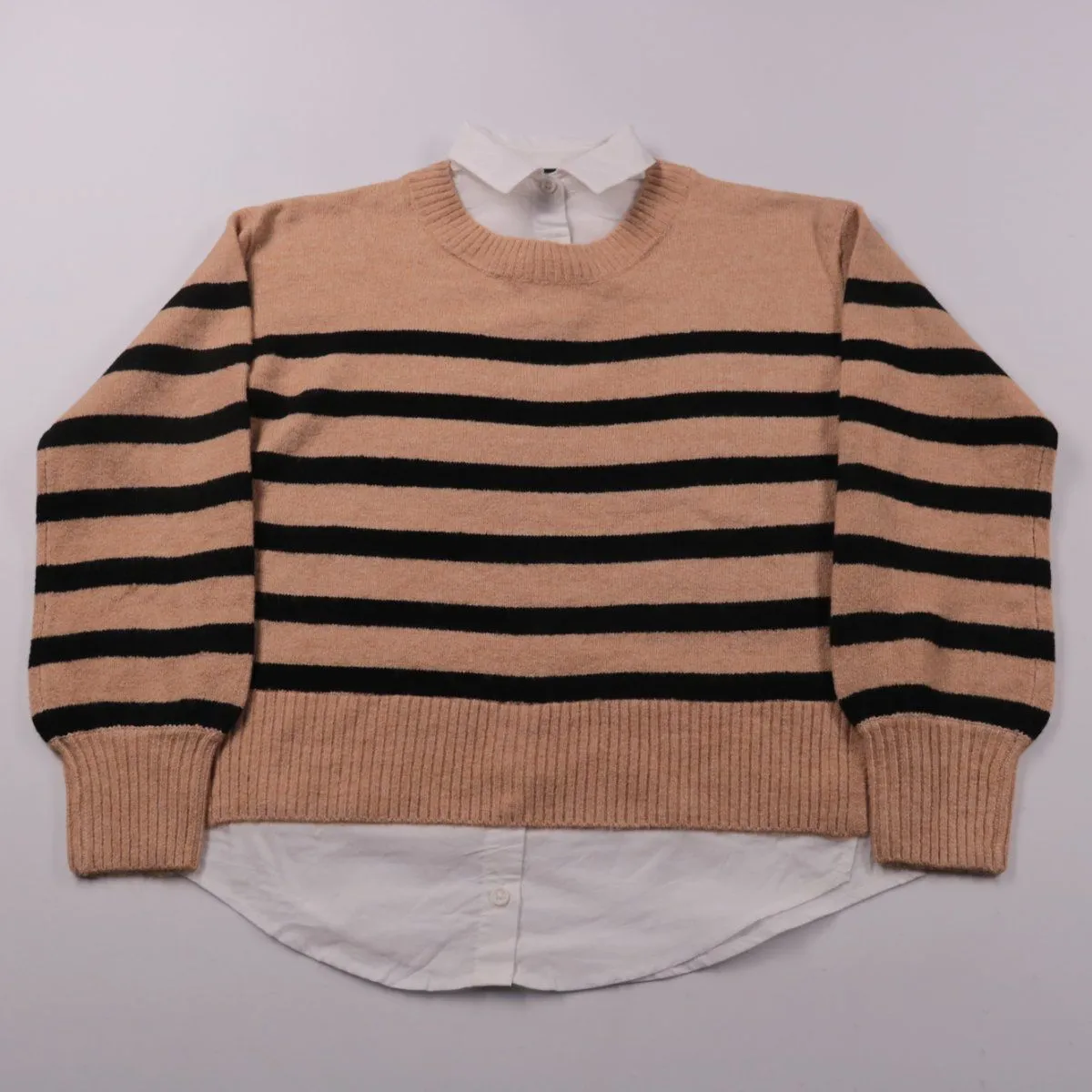 Джемпер George бежевого цвета с чёрными полосками и имитацией белой рубашки. Подойдёт для школы, прогулок и повседневной носки в демисезон. Практичное преимущество — создаёт многослойный образ без отдельной рубашки.