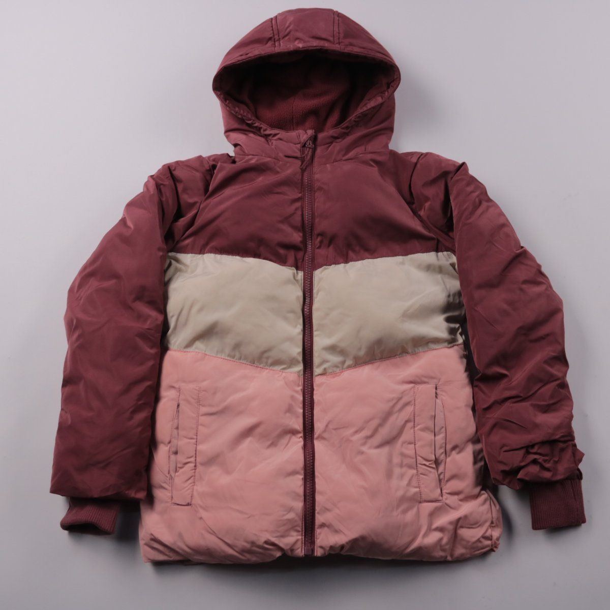 Зимняя куртка Yigga с капюшоном, трёхцветная (бордовый/бежевый/розовый). Подойдёт для прогулок в холодную погоду, в школу и на каждый день. Утеплитель и флисовая подкладка помогают сохранять тепло и комфорт.