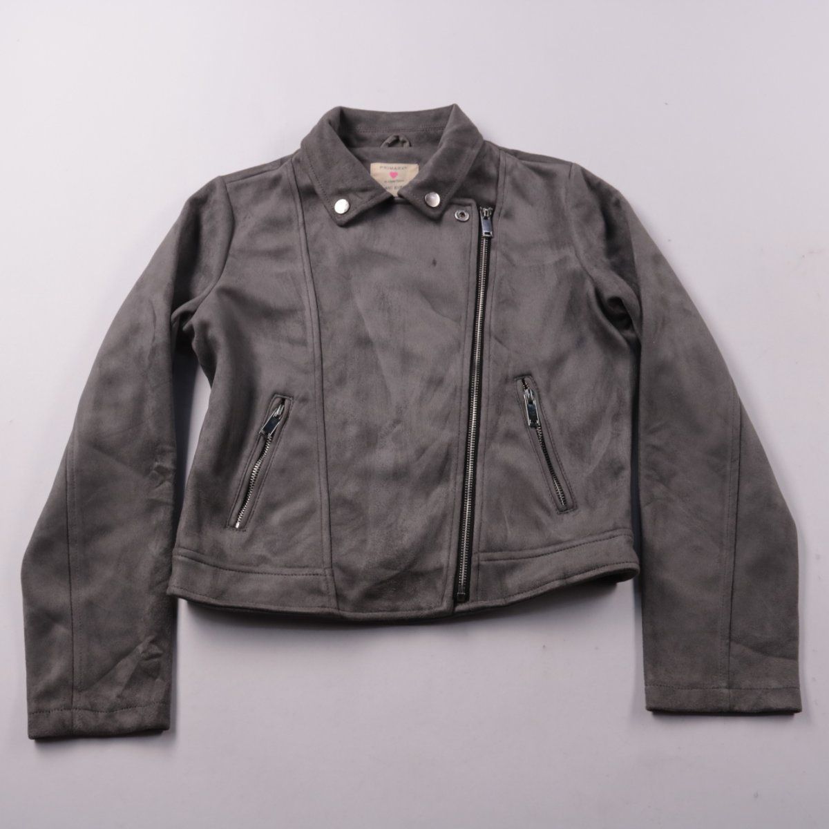Куртка Primark в байкерском стиле из мягкого материала под замшу, серого цвета, с асимметричной молнией и воротником на кнопках. Подойдёт для прохладной весны и осени, удобно носить в городе. Практичный плюс — два боковых кармана на молниях.