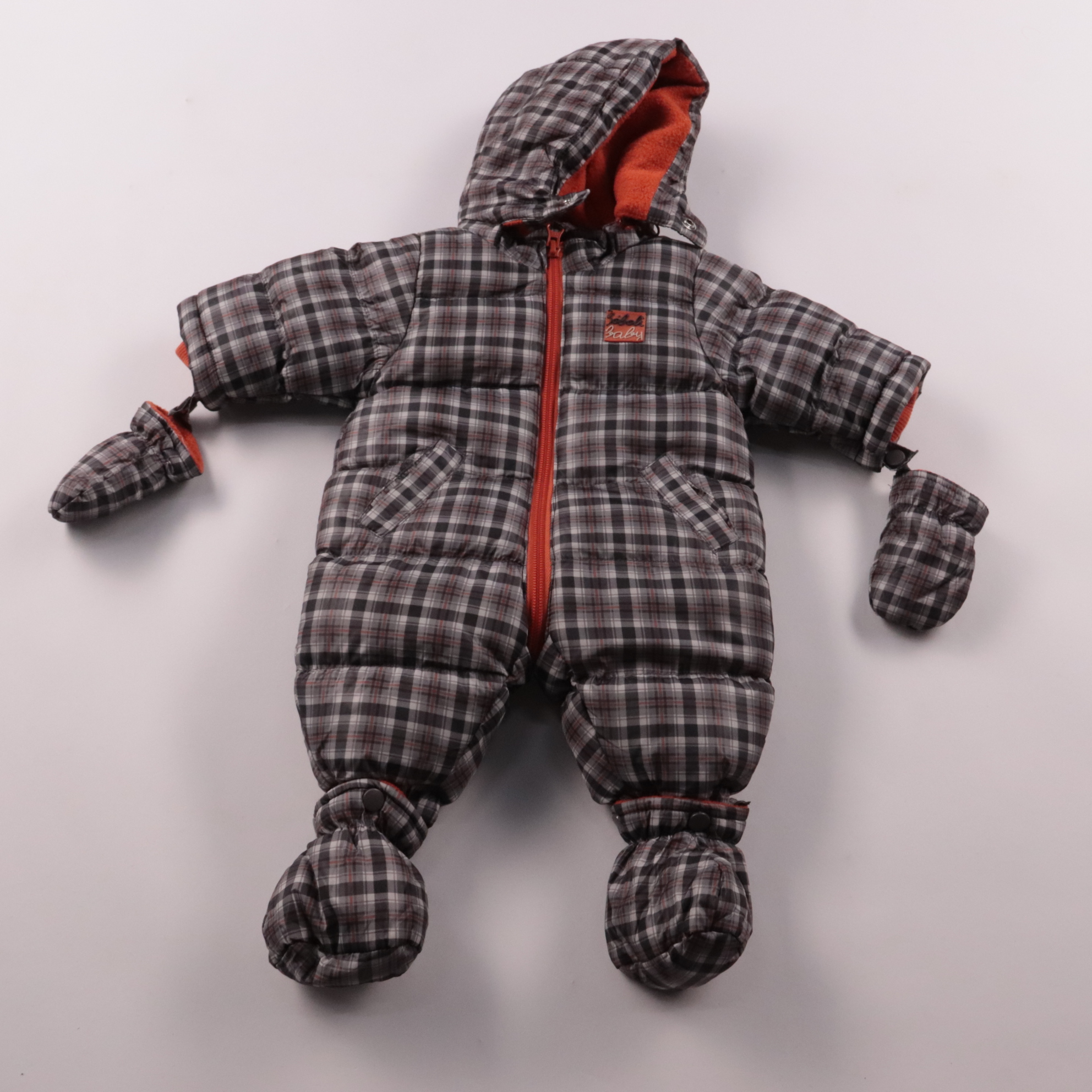 Зимний утеплённый комбинезон Boboli в серую клетку с капюшоном и яркой оранжевой подкладкой. Подойдёт для прогулок в холодную погоду, есть варежки на креплениях. Застёгивается на молнию, удобно быстро одевать ребёнка.