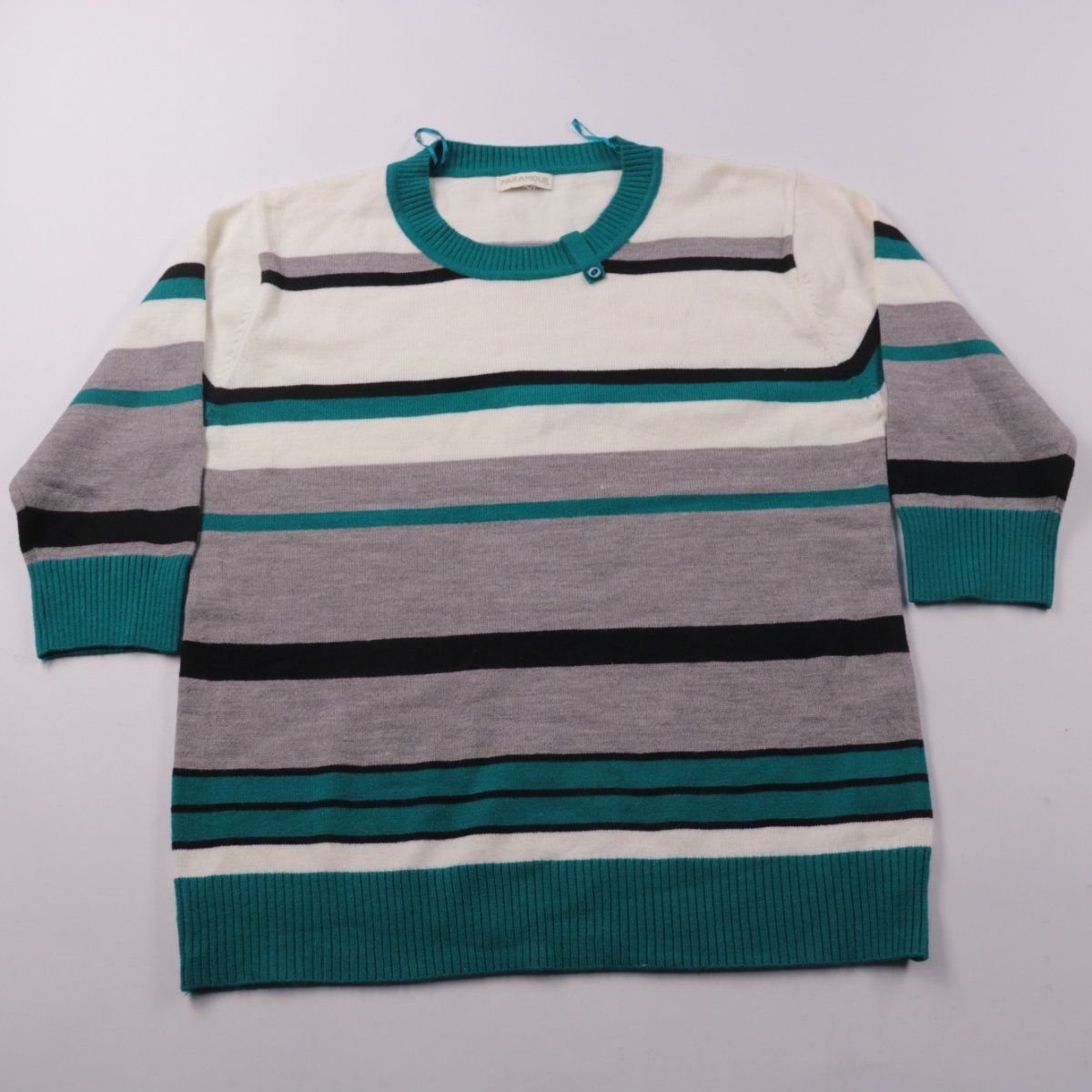 Вязаный свитер Paramour в полоску (белый/серый/чёрный/бирюзовый) с круглым вырезом и кнопкой у горловины. Подойдёт для школы и прогулок в прохладную погоду. Плотная вязка хорошо держит форму и не продувается.