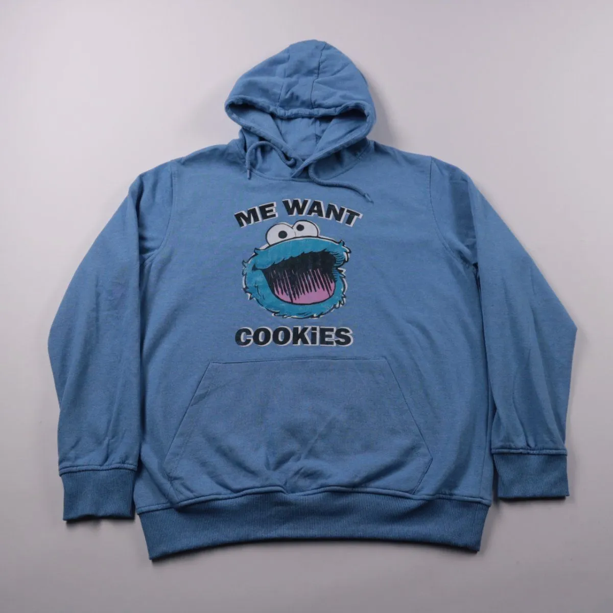 Толстовка Sesame Street голубого цвета с капюшоном и принтом «ME WANT COOKIES» на груди. Подойдёт для школы, прогулок и повседневной носки в прохладную погоду. Есть карман-кенгуру — удобно греть руки или носить мелочи.