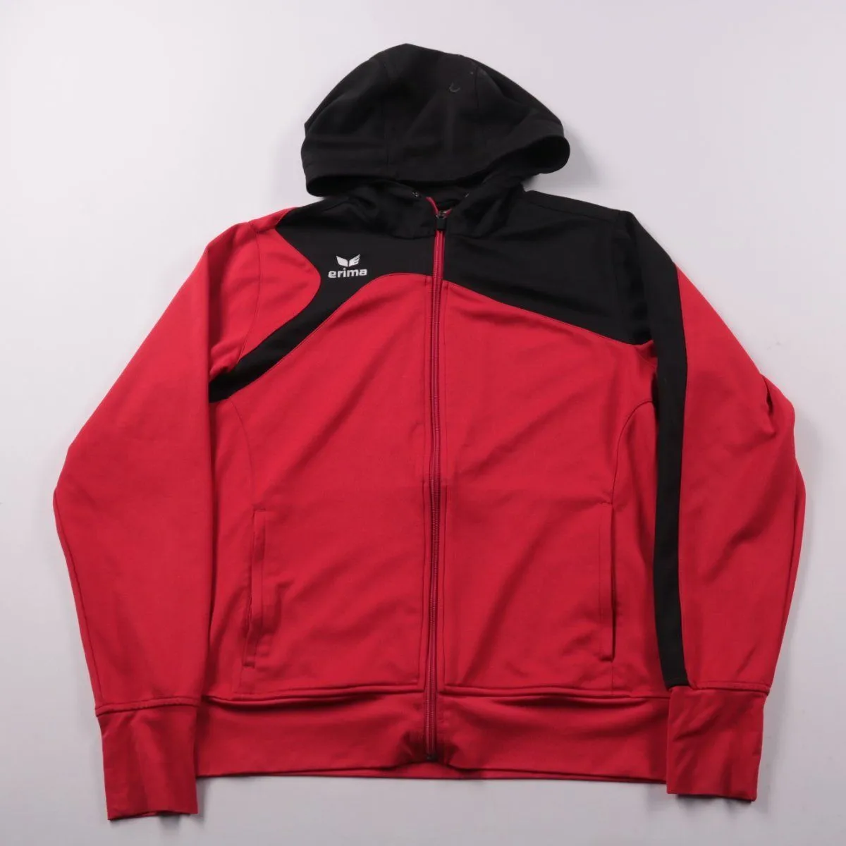 Толстовка Erima на молнии с капюшоном, красно-чёрная, спортивного кроя. Подойдёт для школы, тренировок и прогулок в прохладную погоду. Практичный материал из полиэстера быстро сохнет и удобен в уходе.