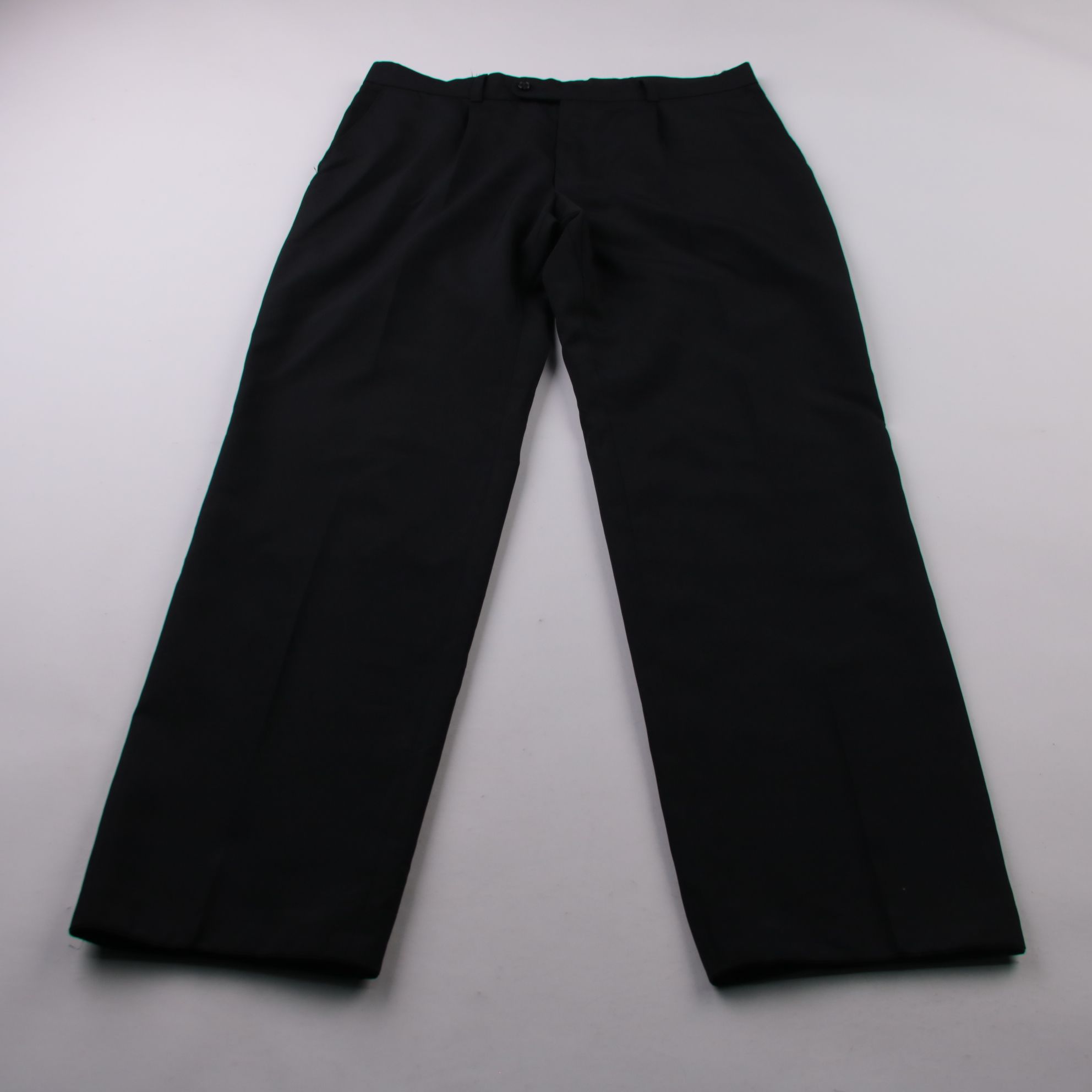 Классические мужские брюки прямого кроя, стиль JOHN, чёрного цвета. Подойдут для офиса и повседневных образов, хорошо сочетаются с рубашкой или свитером. Практичный материал из полиэстера легко переносит уход и меньше мнётся.