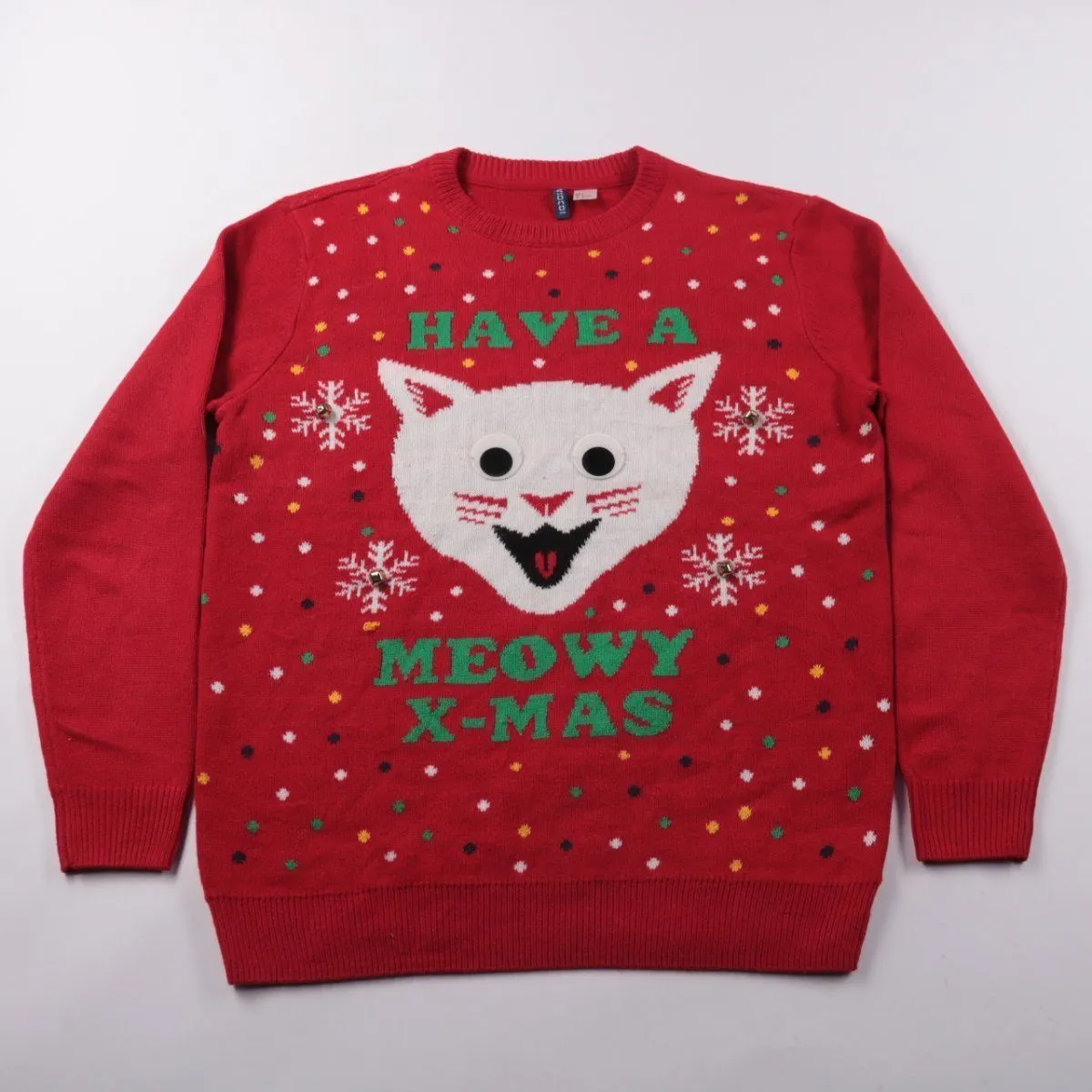 Новогодний свитер H&M красного цвета с принтом кота и надписью «Have a meowy X-mas». Подойдёт для зимних прогулок, праздников и фотосессий, хорошо смотрится с джинсами и чиносами. Плотная вязаная ткань и эластичные манжеты помогают сохранять тепло и держать форму.