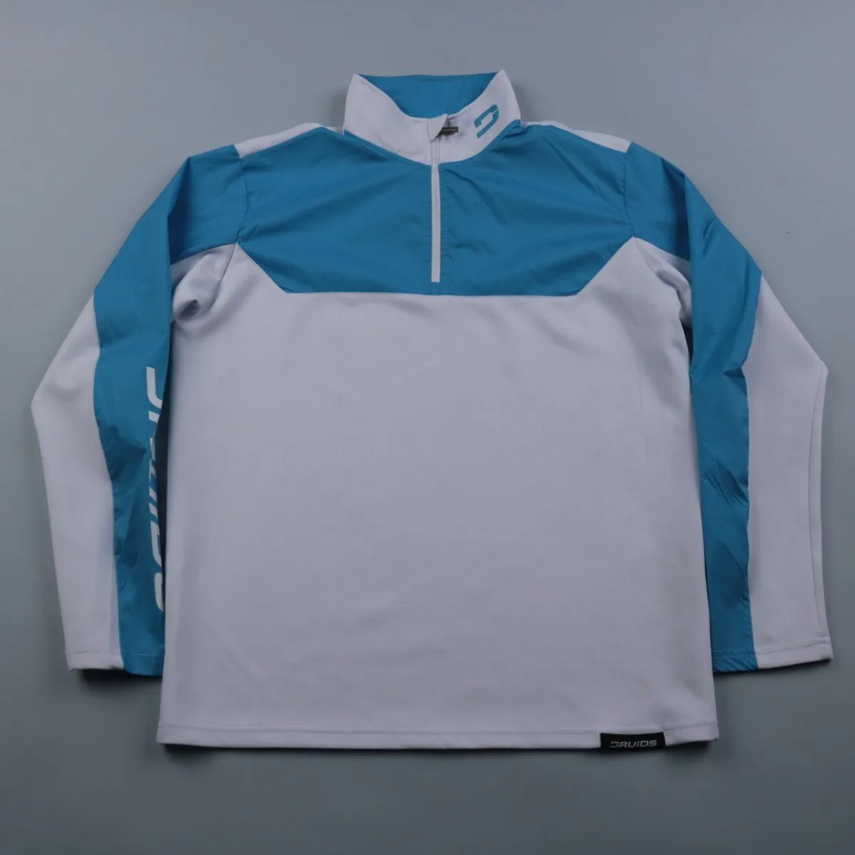 Мужской спортивный джемпер Druids с воротником-стойкой и короткой молнией, выполнен в бело-голубой расцветке. Подойдёт для тренировок и активного отдыха в прохладную погоду благодаря лёгкому эластичному материалу. Быстро сохнет и удобно сидит, не сковывая движений.