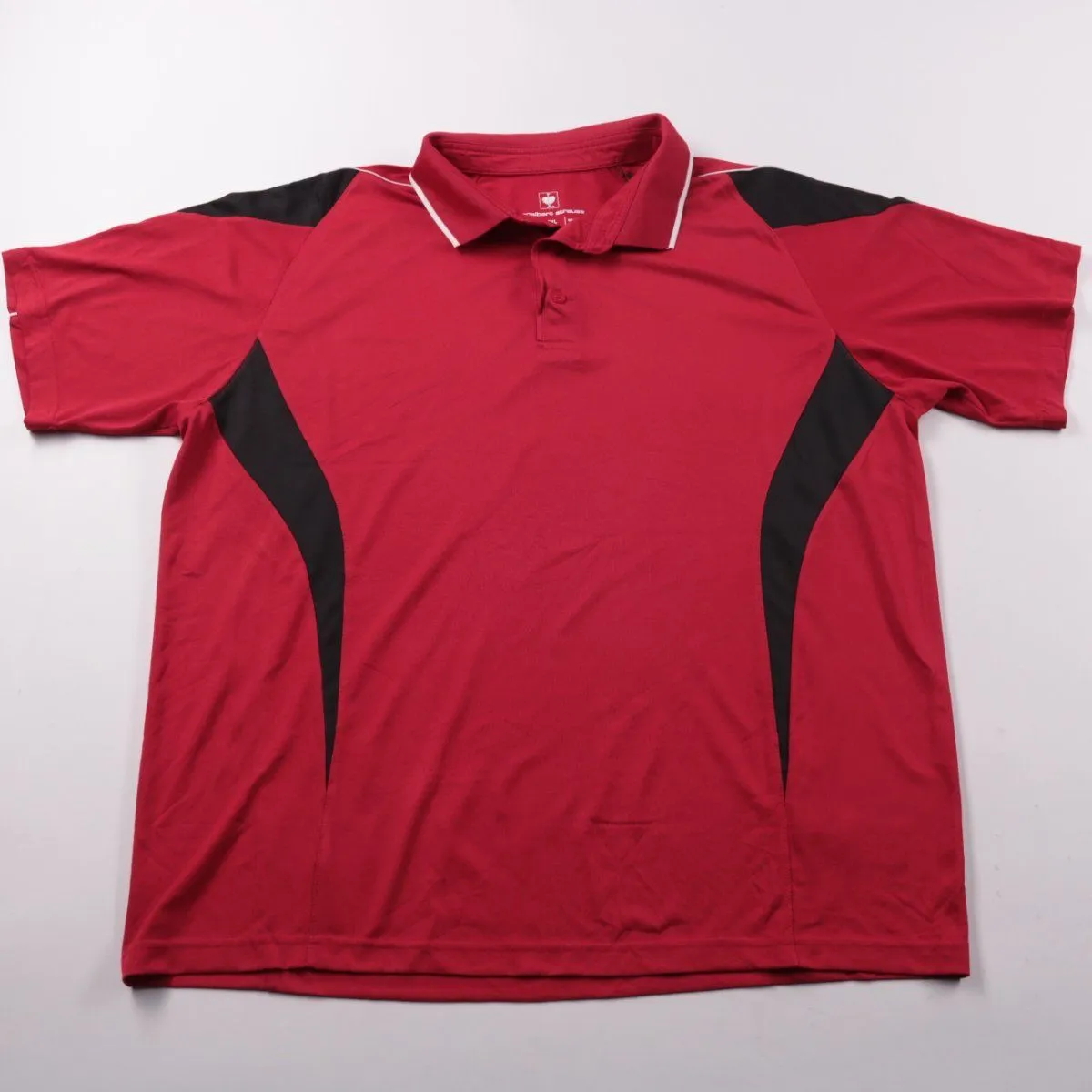Мужское поло Engelbert Strauss красного цвета с чёрными вставками и воротником на пуговицах. Подойдёт для повседневной носки, работы или активного отдыха в тёплую погоду и в помещении. Практичный материал из полиэстера быстро сохнет и неприхотлив в уходе.