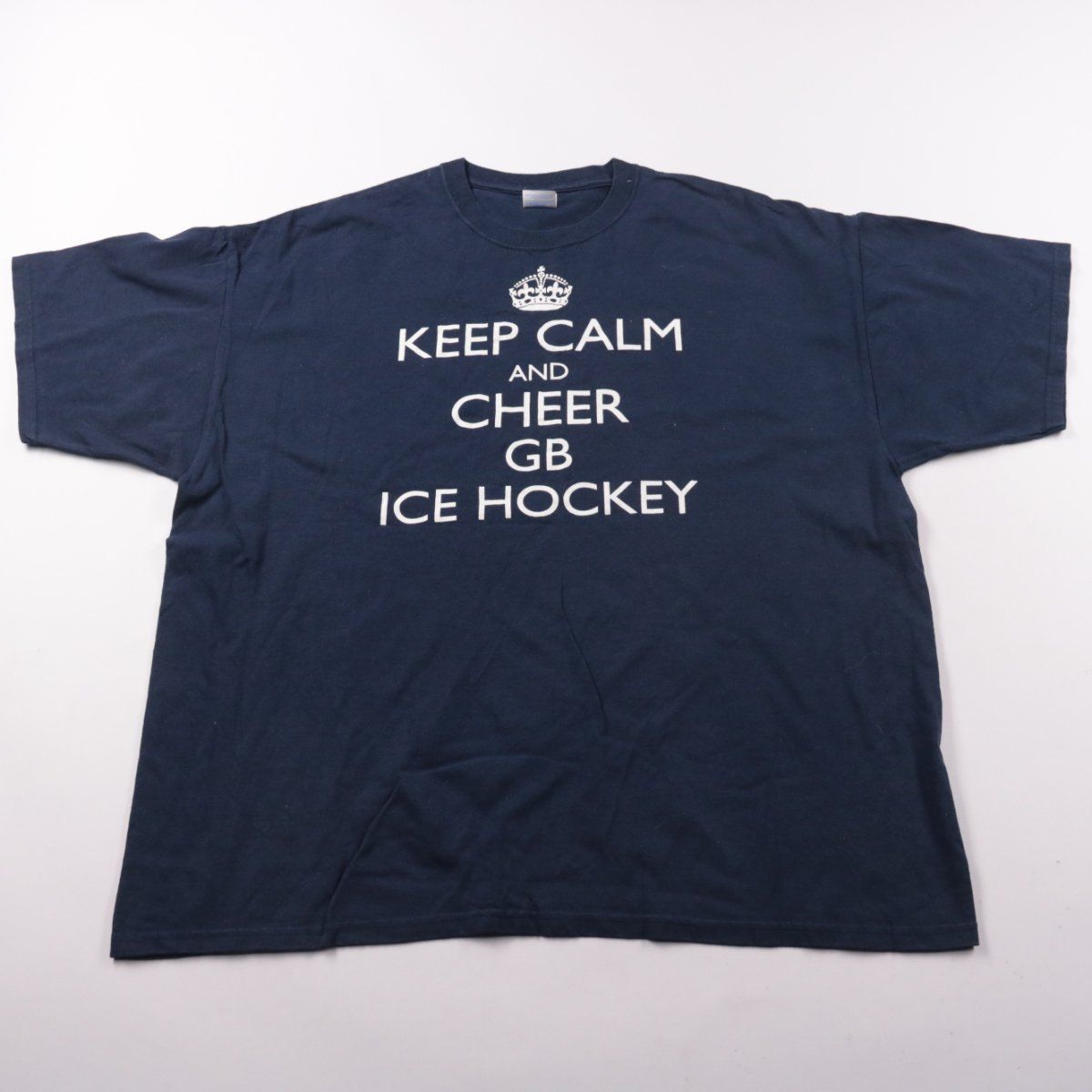 Мужская футболка Gildan Ultra Cotton тёмно-синего цвета с принтом «Keep Calm and Cheer GB Ice Hockey». Подойдёт для повседневной носки и фанатских/спортивных образов. Плотный хлопок хорошо держит форму и комфортен в носке.