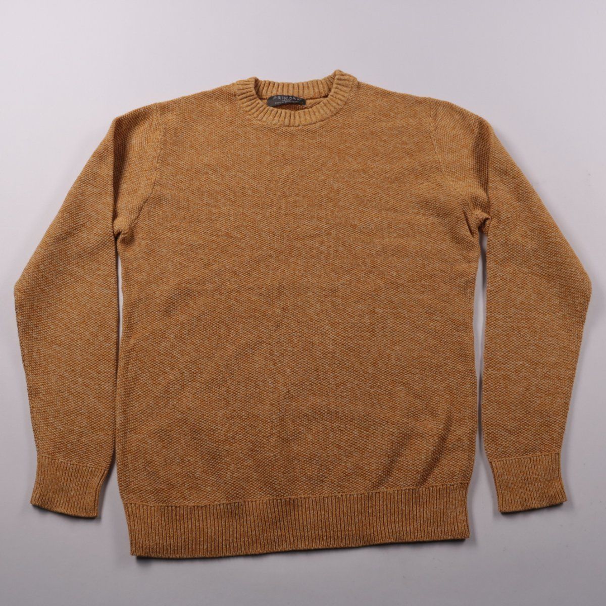 Мужской джемпер Primark в коричневом (camel) цвете с круглым вырезом и фактурной вязкой. Подойдёт для повседневных образов и офиса в прохладную погоду, хорошо смотрится с джинсами или брюками. Практичный плюс — мягкий трикотаж и универсальный цвет легко комбинируется с базовым гардеробом.