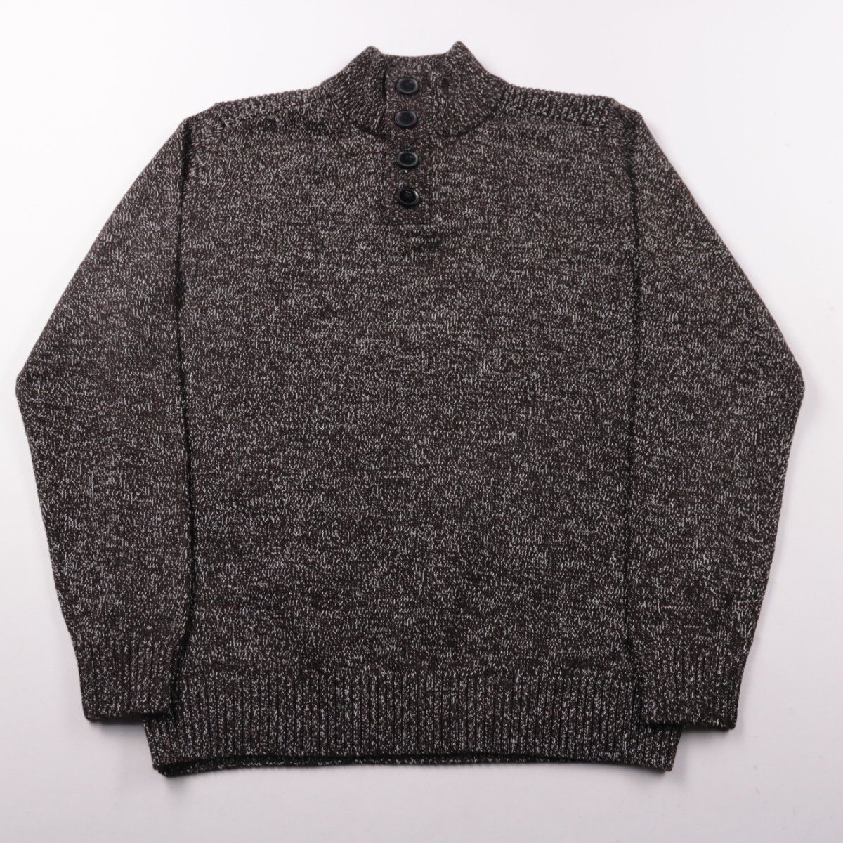 Вязаный джемпер George в коричнево-белом меланже с воротником-стойкой на пуговицах. Подойдёт для прохладной погоды осенью, зимой и в начале весны. Смесовый состав с хлопком делает модель более практичной в повседневной носке.