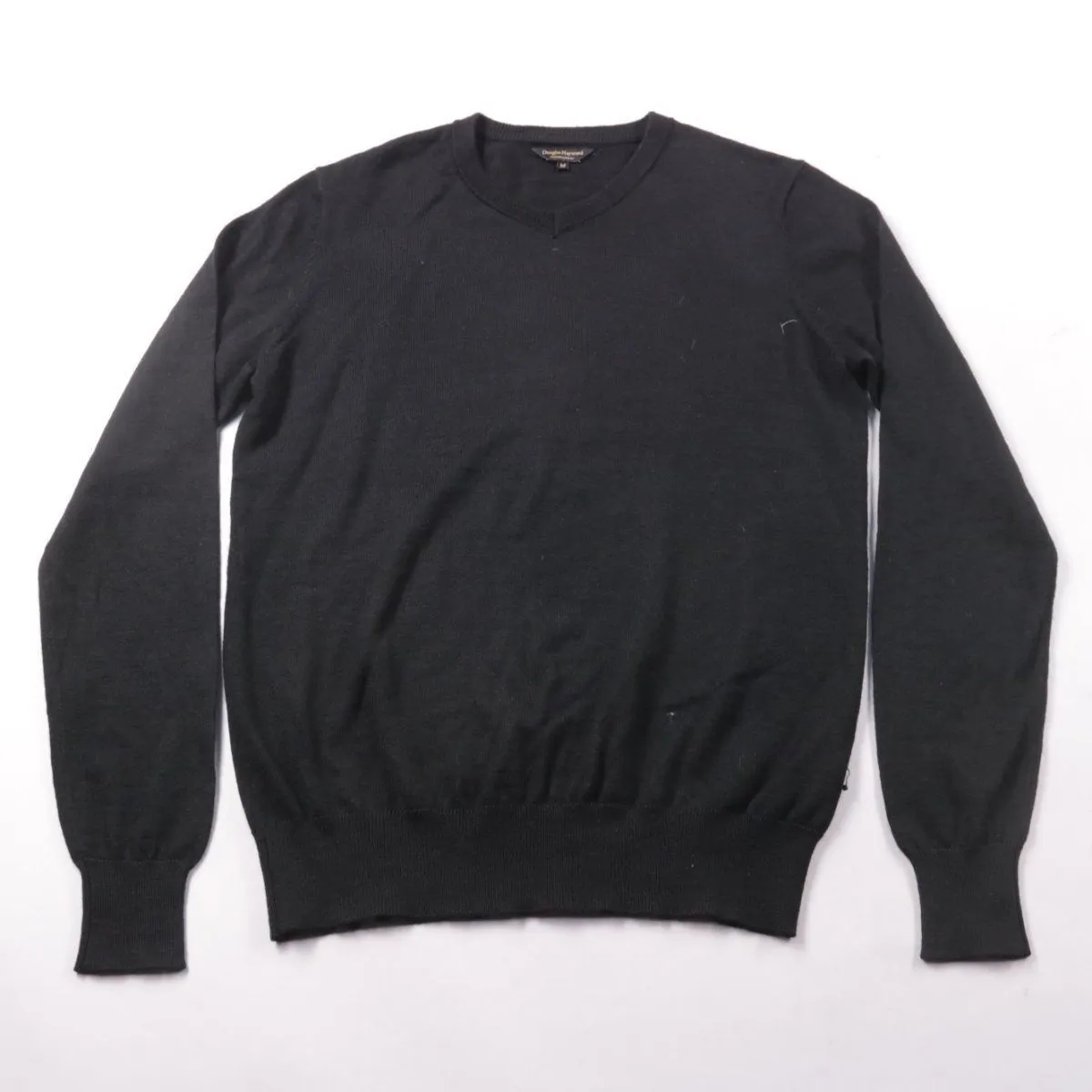 Мужской джемпер Douglas Hayward чёрного цвета с V-образным вырезом и манжетами на рукавах. Подойдёт для повседневной носки и офиса в прохладную погоду. Шерстяная пряжа хорошо сохраняет тепло и комфортна в носке.