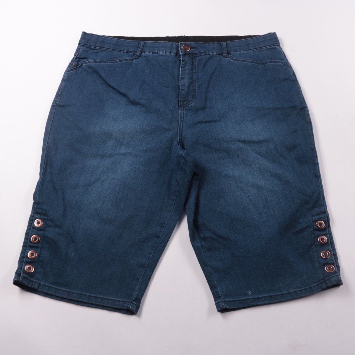 Джинсовые шорты Rockmans синего цвета, длина до колена, с декоративными люверсами по бокам штанин. Подойдут для повседневной носки летом и в отпуске. Смесь с эластаном даёт чуть больше комфорта в движении.