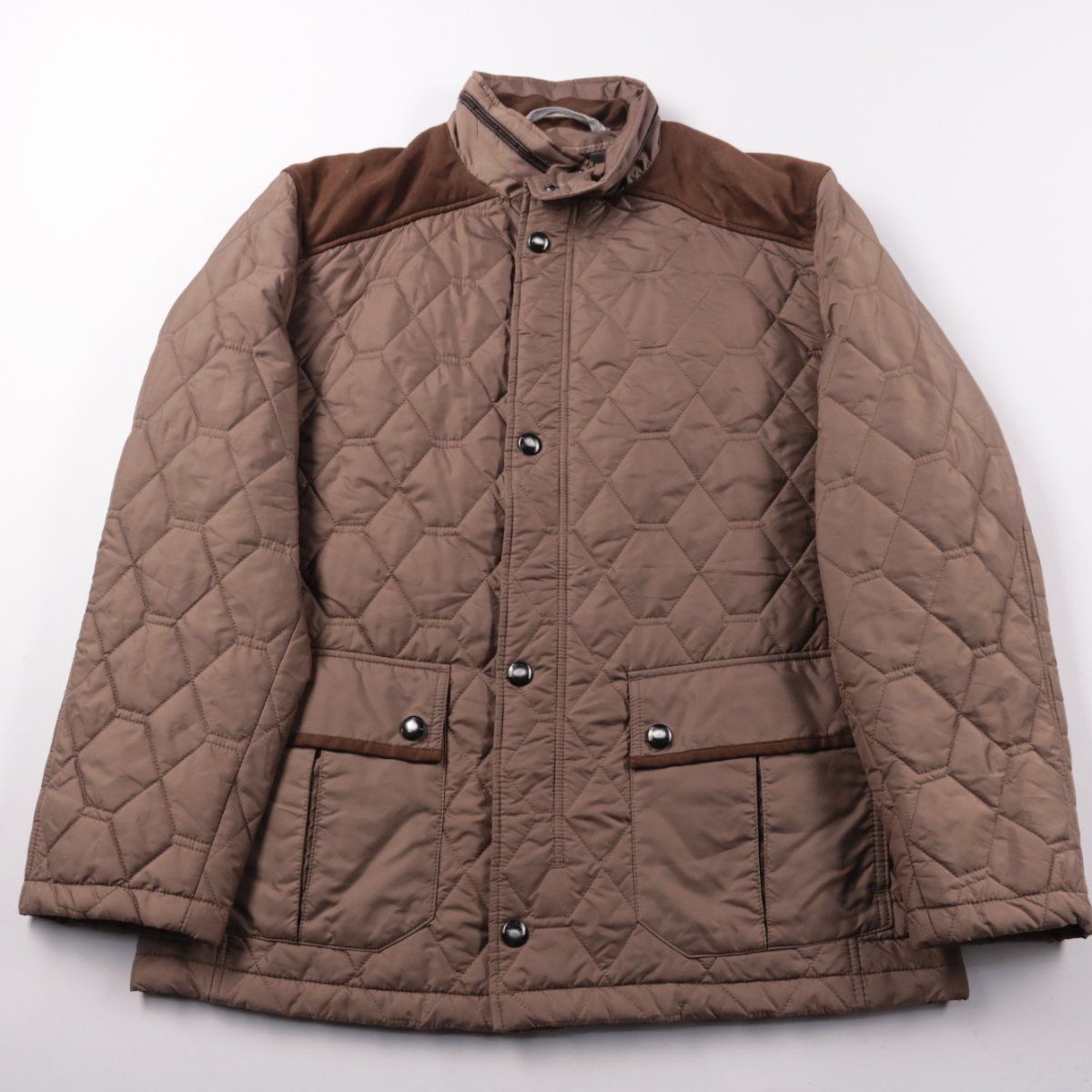 Мужская стёганая куртка Bugatti коричневого цвета с воротником-стойкой и кнопками/молнией. Подойдёт для прохладной погоды весной и осенью, хорошо смотрится с джинсами и повседневной обувью. Практичный плюс — лёгкий полиэстер и удобные карманы с клапанами на кнопках.