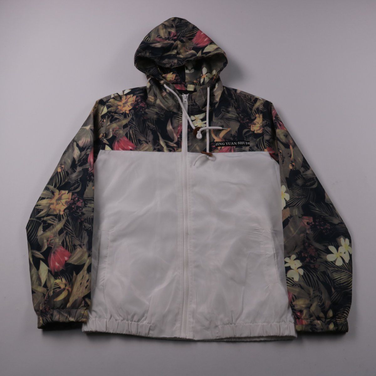 Лёгкая ветровка с капюшоном и цветочным принтом, застёгивается на молнию. Подойдёт для прогулок и поездок в прохладную или ветреную погоду. Практичный плюс — капюшон и лёгкая ткань, удобно брать с собой.
