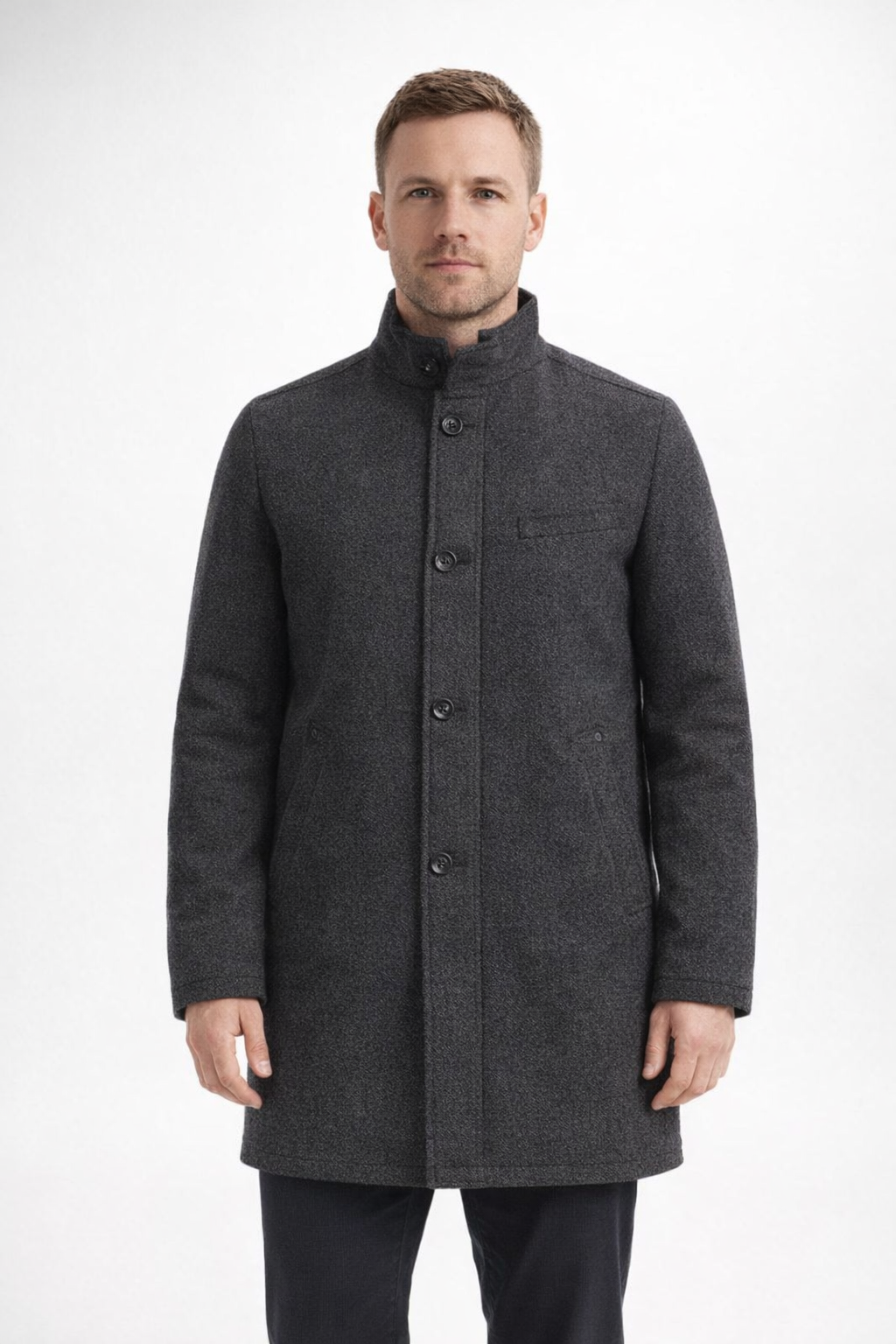Мужское пальто Daniel Hechter тёмно-серого цвета с воротником-стойкой и застёжкой на пуговицы. Подойдёт для повседневной носки и офиса в прохладную погоду, легко сочетается с брюками и джинсами. Практичный плюс — плотная ткань и лаконичный крой, которы...