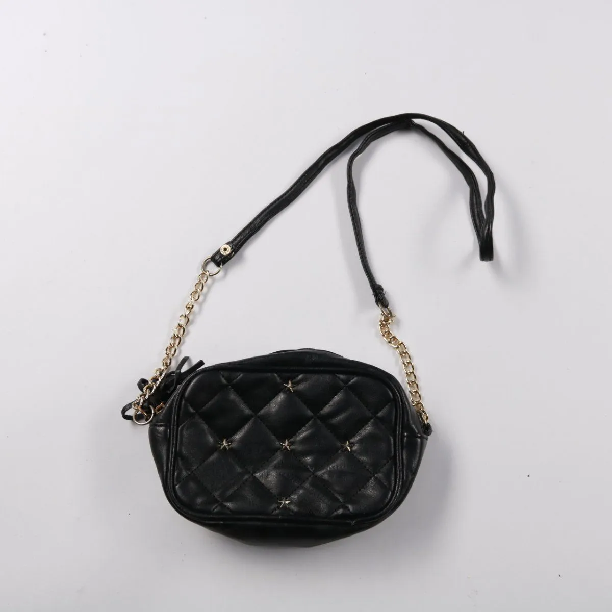 Небольшая чёрная сумка кросс–боди со стёганым корпусом и цепочкой на ремешке. Подойдёт для прогулок и повседневных образов, когда нужно взять с собой только самое необходимое. Лёгкая и компактная, удобно носится через плечо.