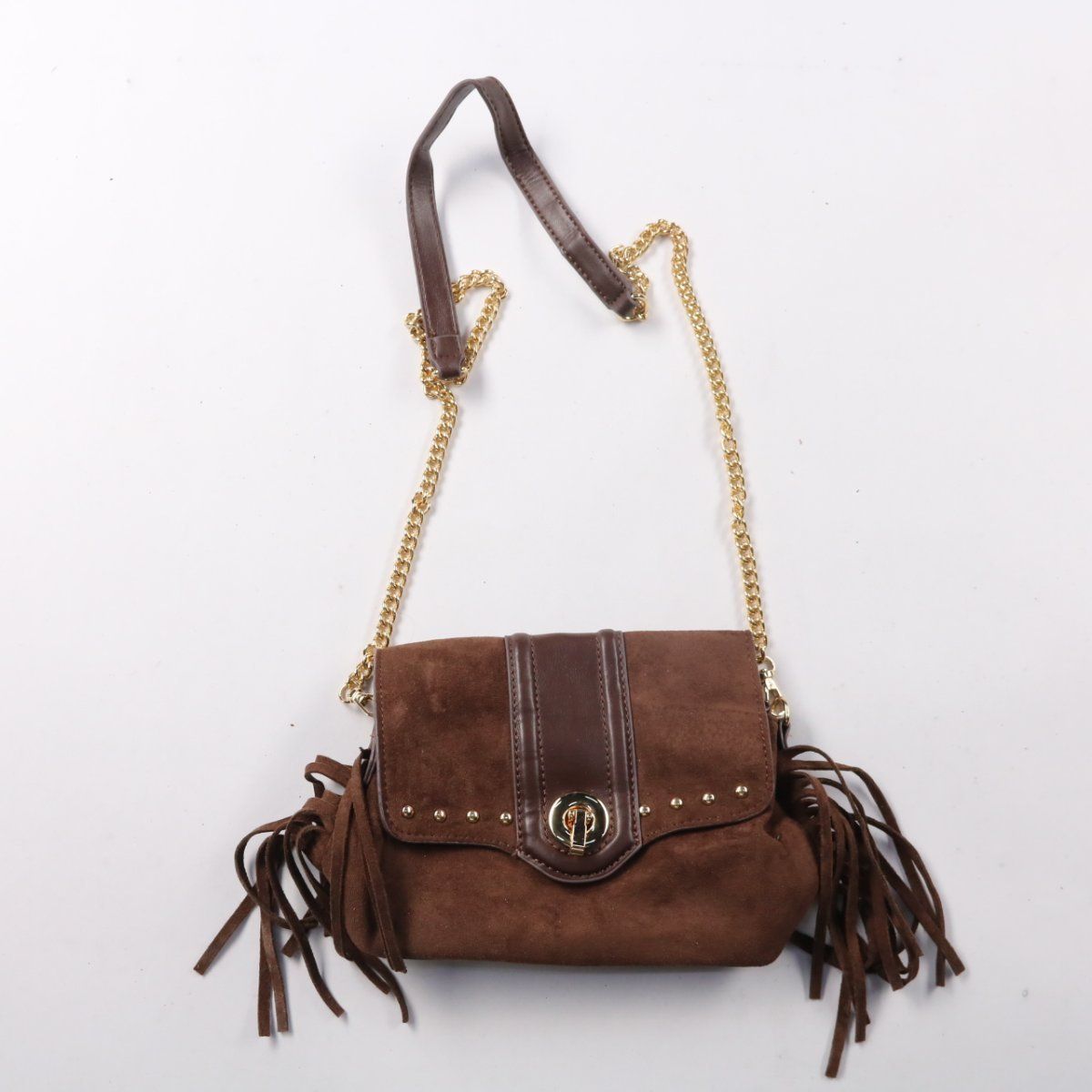 Сумка через плечо с бахромой и цепочным ремнём, бренд не указан. Подойдёт для повседневных выходов и образов в стиле casual/boho, закрывается на поворотный замок под клапаном. Практичный плюс — компактный формат и несколько отделений внутри для мелочей.