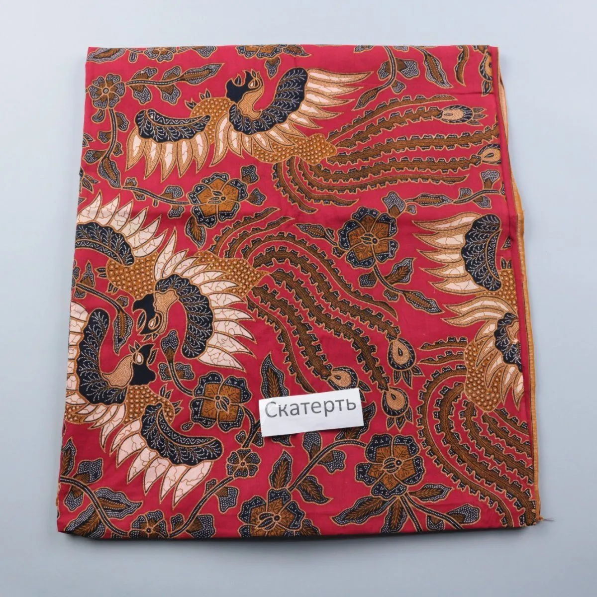 Скатерть с ярким орнаментом в красных и золотистых тонах, подходит для сервировки стола дома или на даче. Хорошо смотрится на праздничных застольях и в повседневном использовании, добавляя акцент в интерьер. Ткань практичная в уходе и помогает защитить поверхность стола от загрязнений.