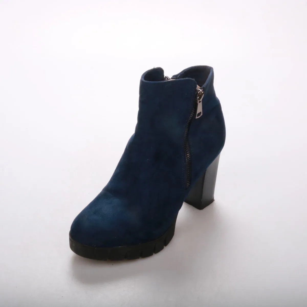 Женские ботильоны S.S из замши в темно-синем цвете, на устойчивом каблуке и удобной молнии сбоку. Подойдут для повседневной носки в демисезон с джинсами, брюками или платьем. Рифлёная подошва даёт хорошее сцепление и устойчивость на дороге.