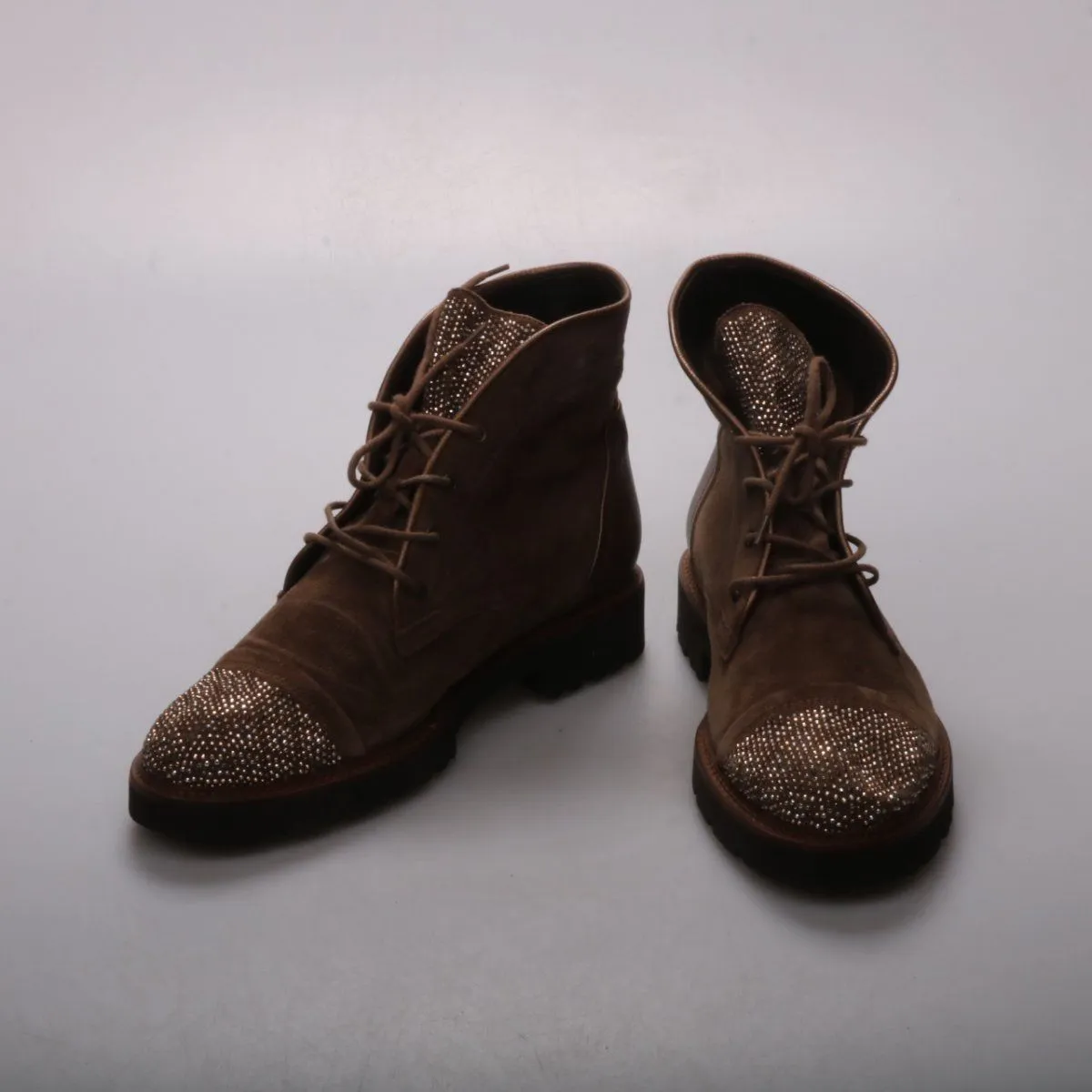 Ботильоны Gabor коричневого цвета на шнуровке, с декоративной отделкой стразами на носке и язычке. Подойдут для повседневной носки в демисезон, хорошо сочетаются с джинсами и брюками. Практичная подошва с протектором даёт более устойчивый шаг.
