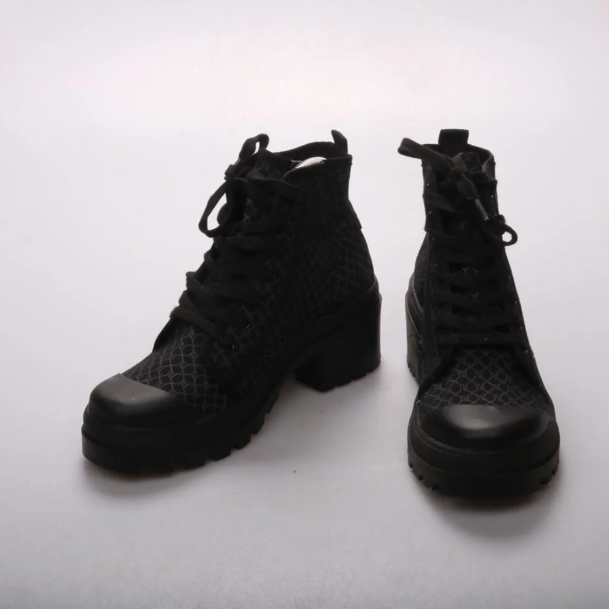 Ботильоны River Island чёрного цвета на шнуровке с фактурным верхом и защитной накладкой на носке. Подойдут для повседневных образов в межсезонье, хорошо сочетаются с джинсами и платьями. Тракторная подошва и устойчивый каблук дают хорошее сцепление и комфорт при ходьбе.