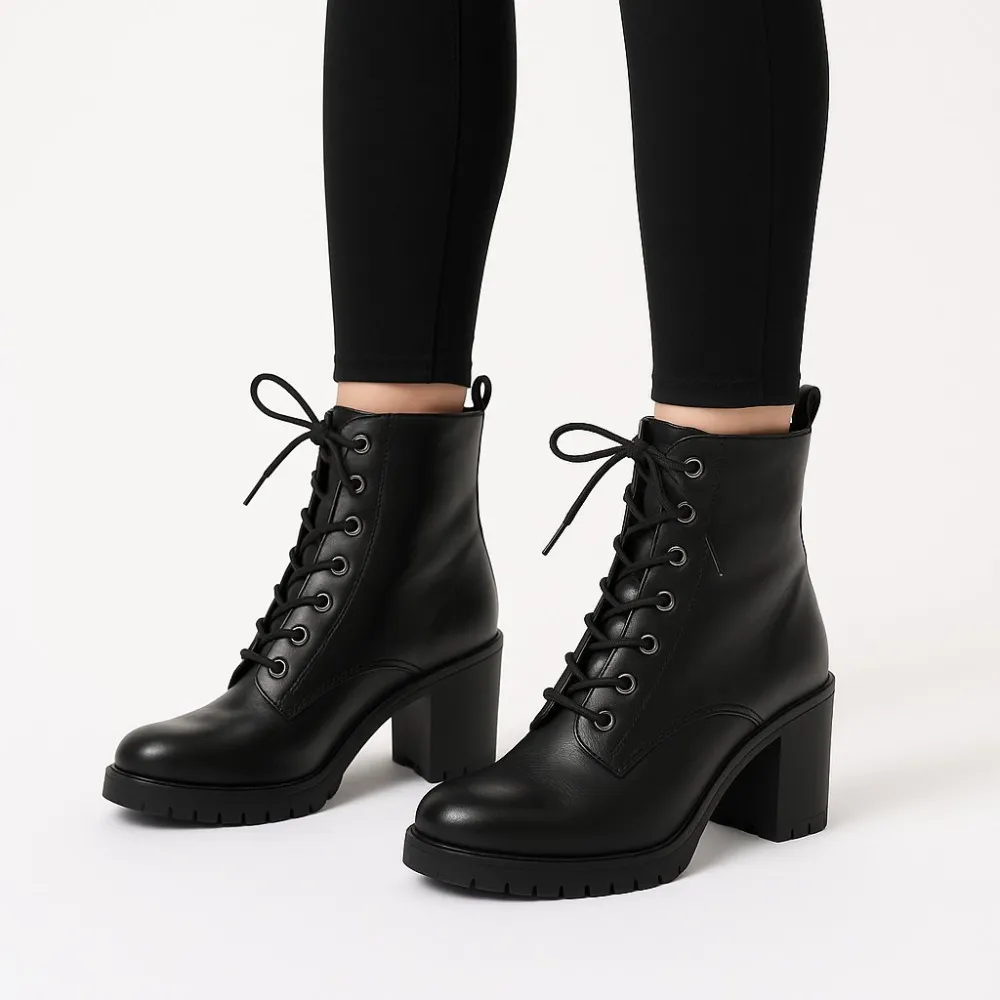 Черные женские ботинки на шнуровке с боковой молнией и устойчивым каблуком. Подойдут для повседневных образов в прохладную погоду с джинсами, платьями или юбками. Рельефная подошва дает хорошее сцепление и удобна для ходьбы.