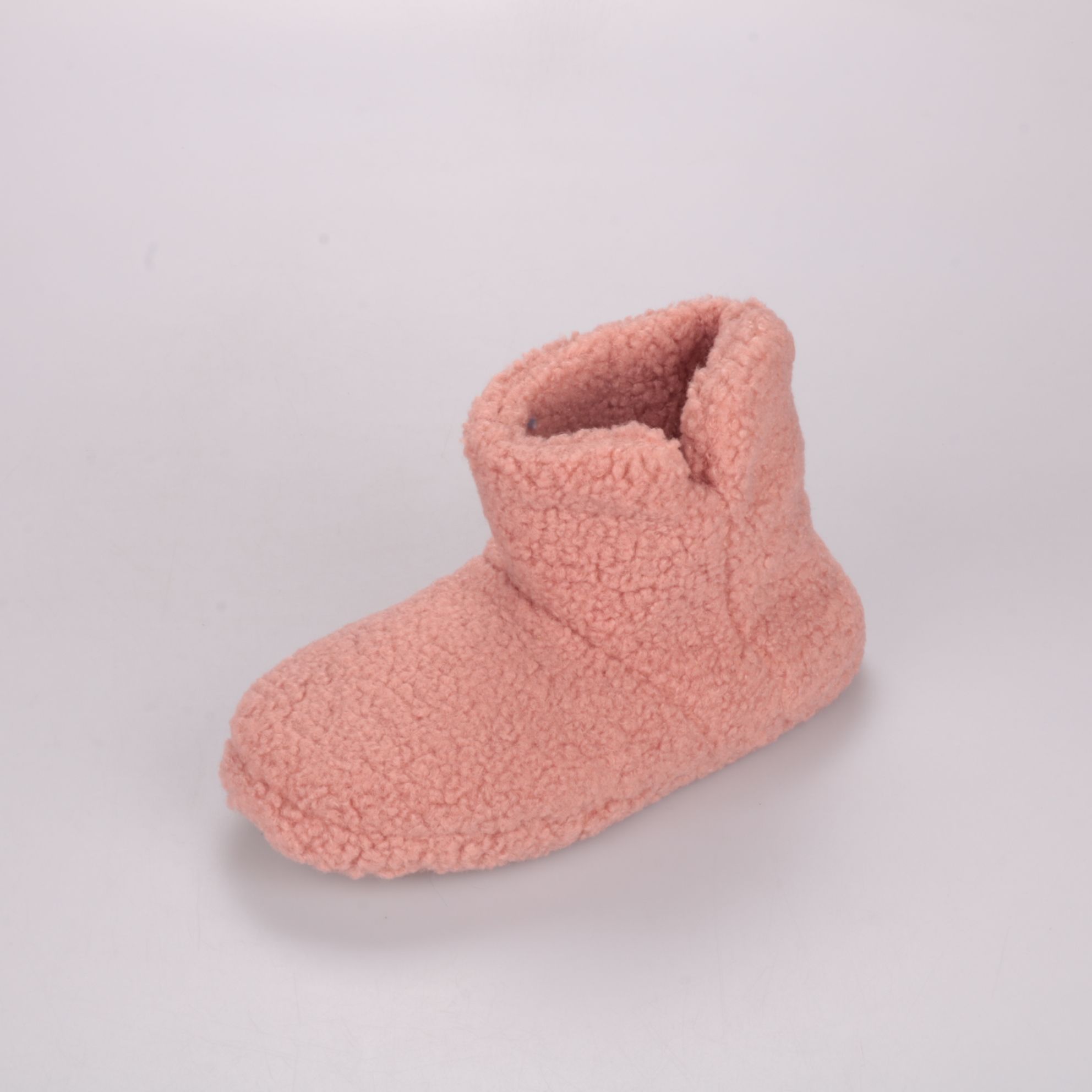 Домашние тапочки-ботинки из мягкого текстиля (плюш/шерпа) в нежно-розовом цвете. Удобны для дома и дачи: закрытая форма и высокий мягкий бортик сохраняют тепло. Лёгкая подошва с рельефом меньше скользит на полу.
