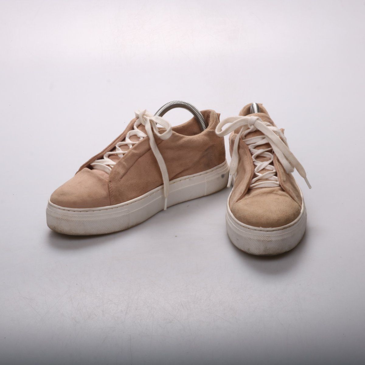 Кеды из замши в бежевом цвете на белой резиновой подошве, со шнуровкой. Подойдут для повседневных прогулок и базовых образов в городе. Практичное преимущество — толстая подошва хорошо амортизирует при ходьбе.