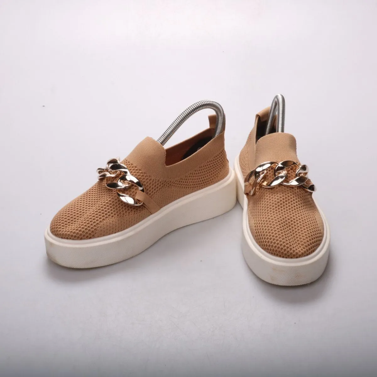 Женские слипоны без бренда из вязаного текстиля бежевого цвета, с декоративной металлической цепью на подъёме. Подойдут для повседневных летних образов и поездок, когда важен комфорт. Толстая белая подошва хорошо амортизирует и изолирует от горячего асфальта.