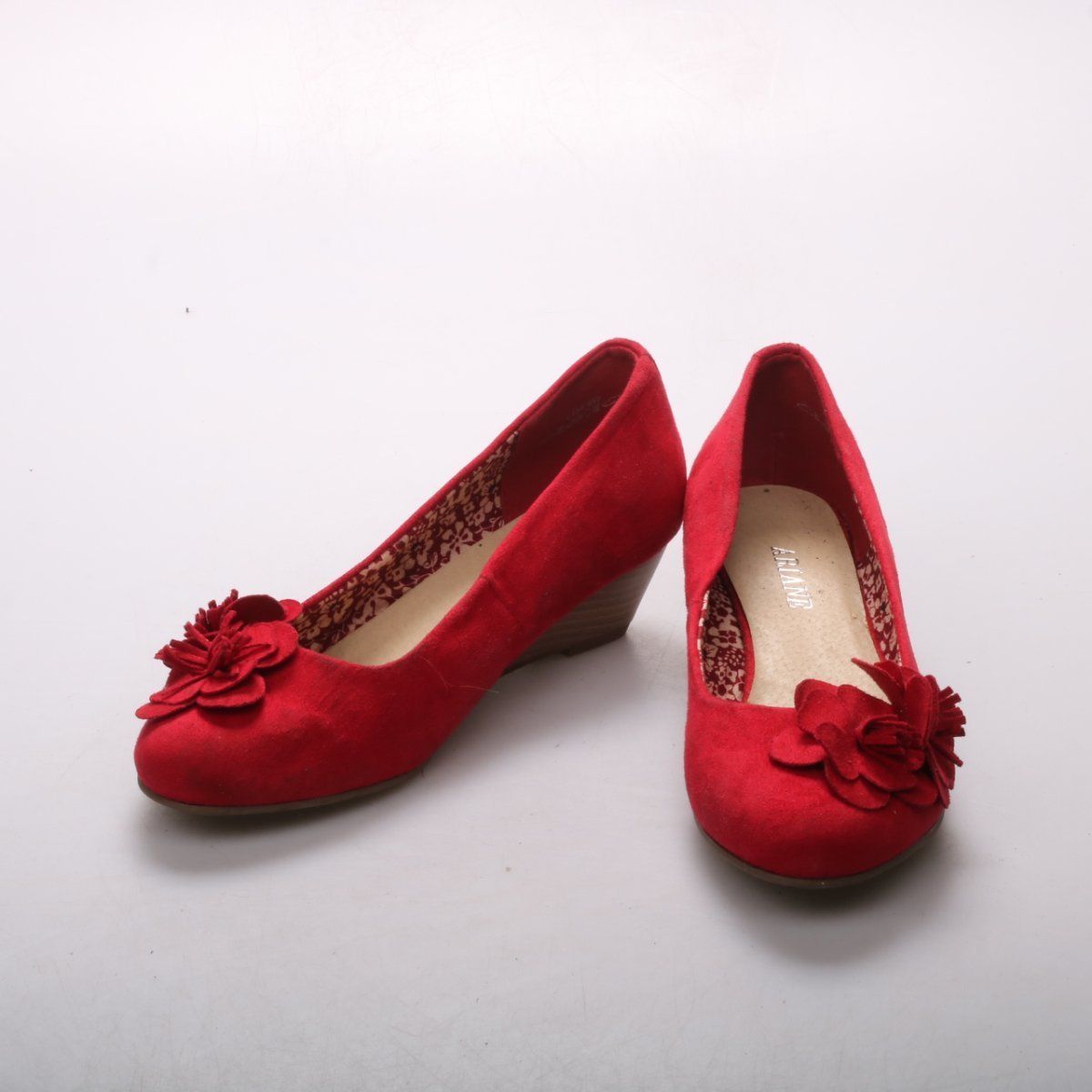Женские туфли Ariane из замшевого материала ярко-красного цвета, с декором в виде цветка на мысе. Подойдут для повседневных образов и офиса в тёплое время или в помещении. Устойчивая танкетка удобнее классического каблука и комфортна при ходьбе.