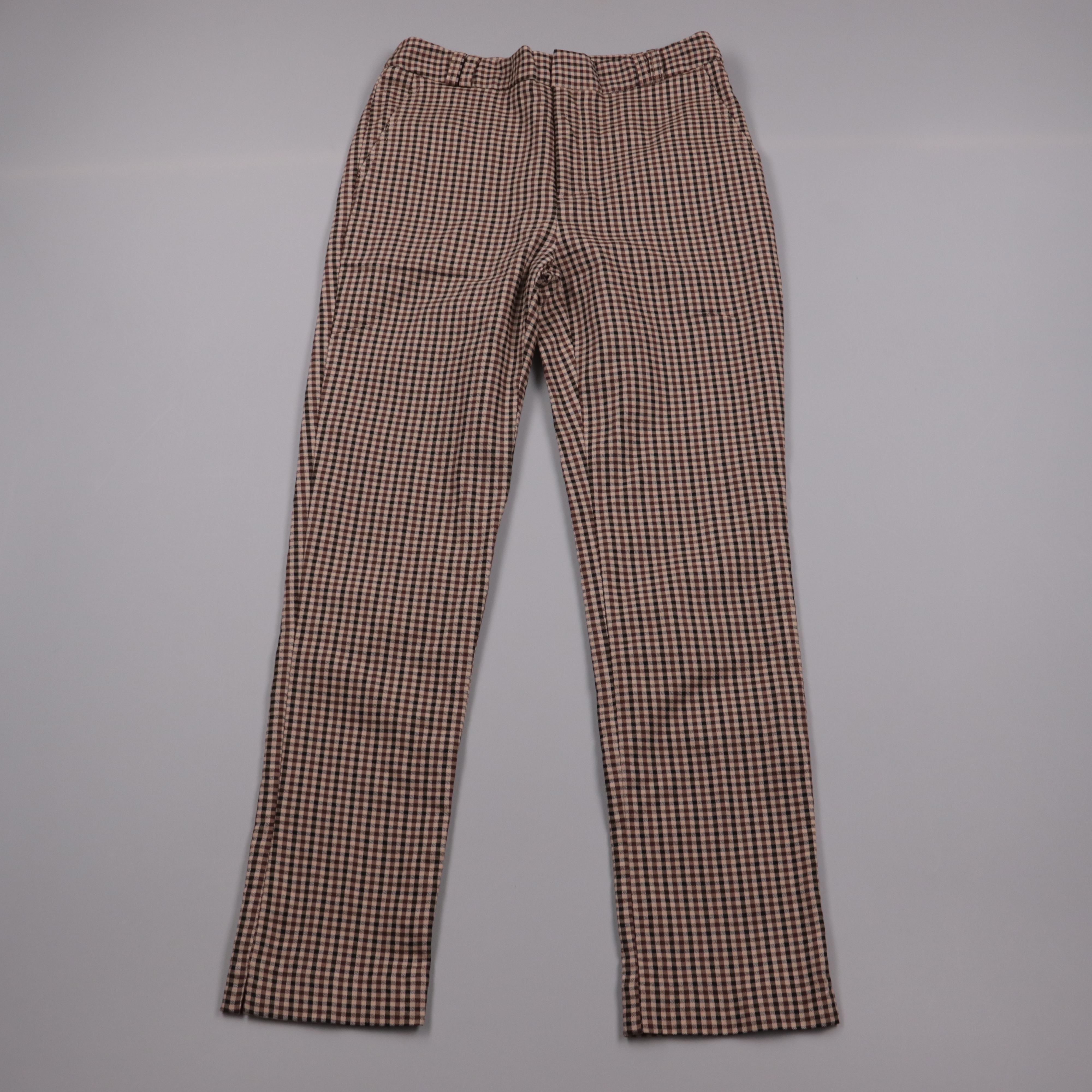Женские брюки Stradivarius в мелкую клетку в бежево-коричневой гамме, классический прямой крой. Подойдут для офиса и на каждый день, хорошо сочетаются с однотонными рубашками и свитерами. Практичный плюс — плотная ткань и спокойный принт, который легко...